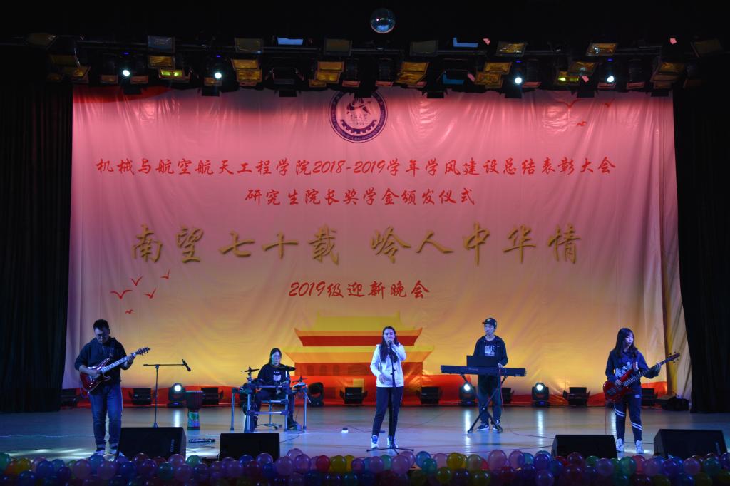 表彰大会结束后,迎新晚会在北归乐队激动人心的暖场串烧中拉开帷幕。国运与校运相互交织,开场的首个节目是由大一合唱与朗诵团带来的《我爱你中国+少年中国说》,铿锵有力的朗诵与激情澎湃的合唱点燃了全场的气氛。随后的额歌曲《大中国》更是将南岭人的中华情,歌唱的淋漓尽致。两个古装小品带给全场观众许多欢笑,并将晚会的气氛推向了高潮。公司的各个社团也不甘示弱,街舞社的酷歌热舞,古风社、书法社、陶笛社的舞蹈书法展示,轮滑社的精彩表演,无不彰显了南岭人的青春活力。最后,晚会在所有演职人员的《我和我的祖国》合唱中中完美落下帷幕。