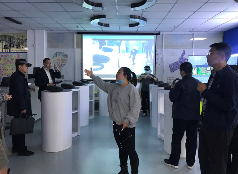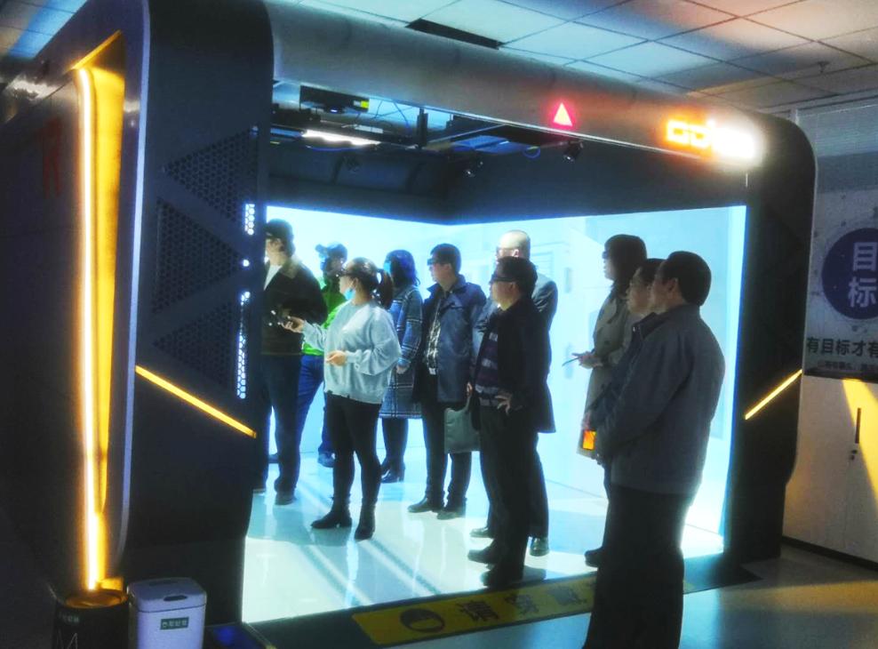 研讨会结束后,双创项目团队成员来到机械虚拟仿真实验教学中心实践基地,体验了中心的VR虚拟现实、AR增强现实和MR混合现实教学区域的配套设施设备,交流了实践基地的整体布局和建设情况。