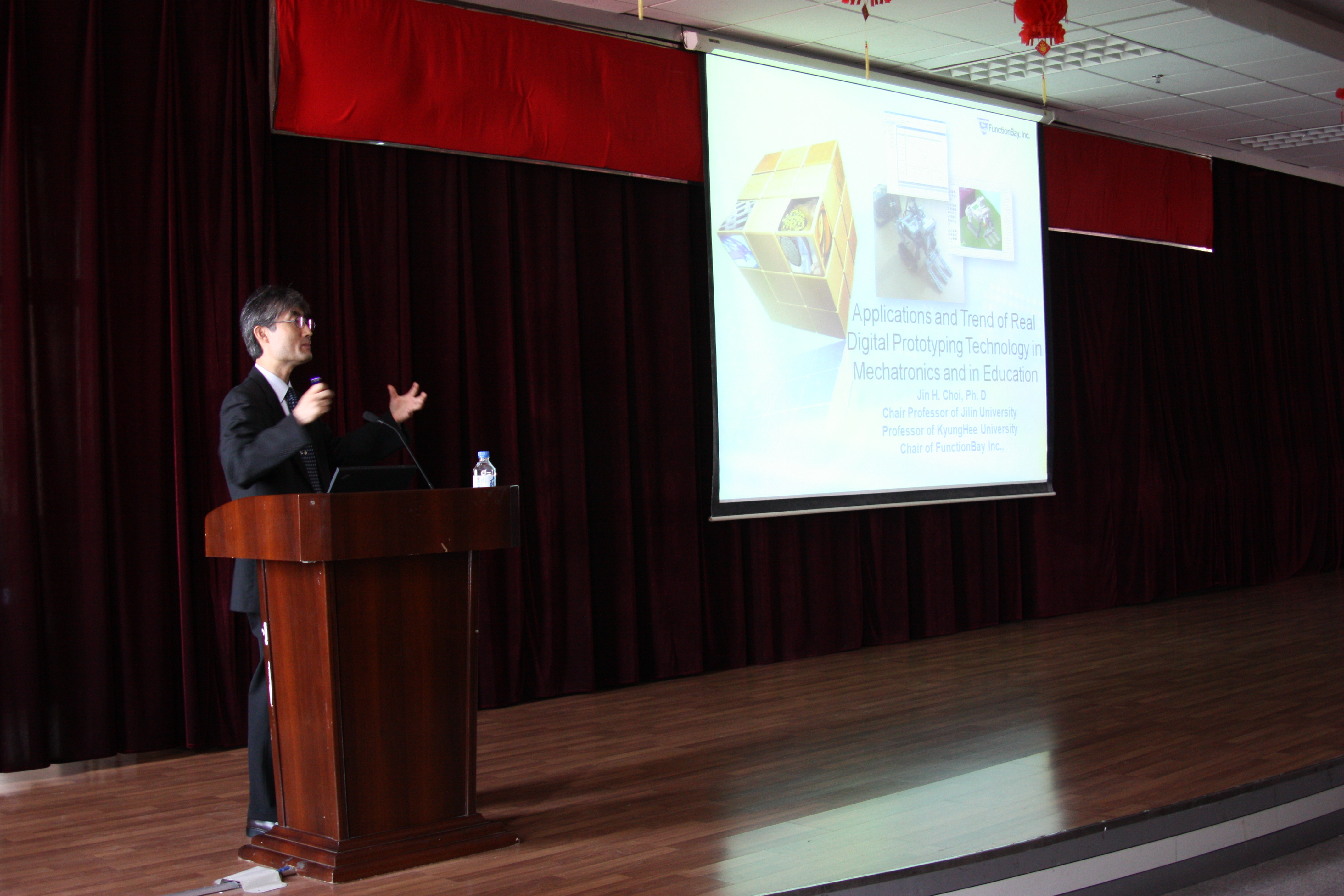 崔轸焕教授详细地阐述了数字化设计与分析方法、实境数字化样机(RDP)技术在机电一体化及其教学中的应用等几个方面的内容,并与在座师生就相关问题展开了讨论,现场气氛十分活跃。