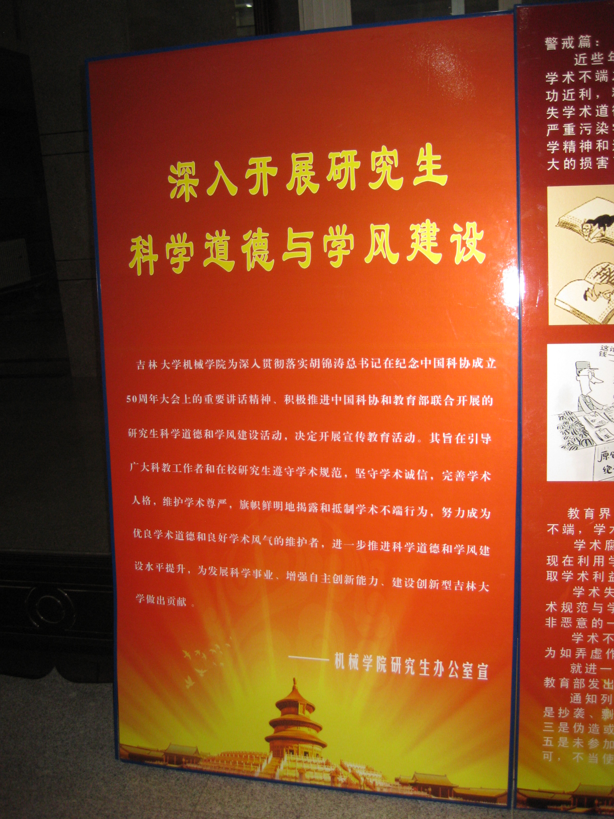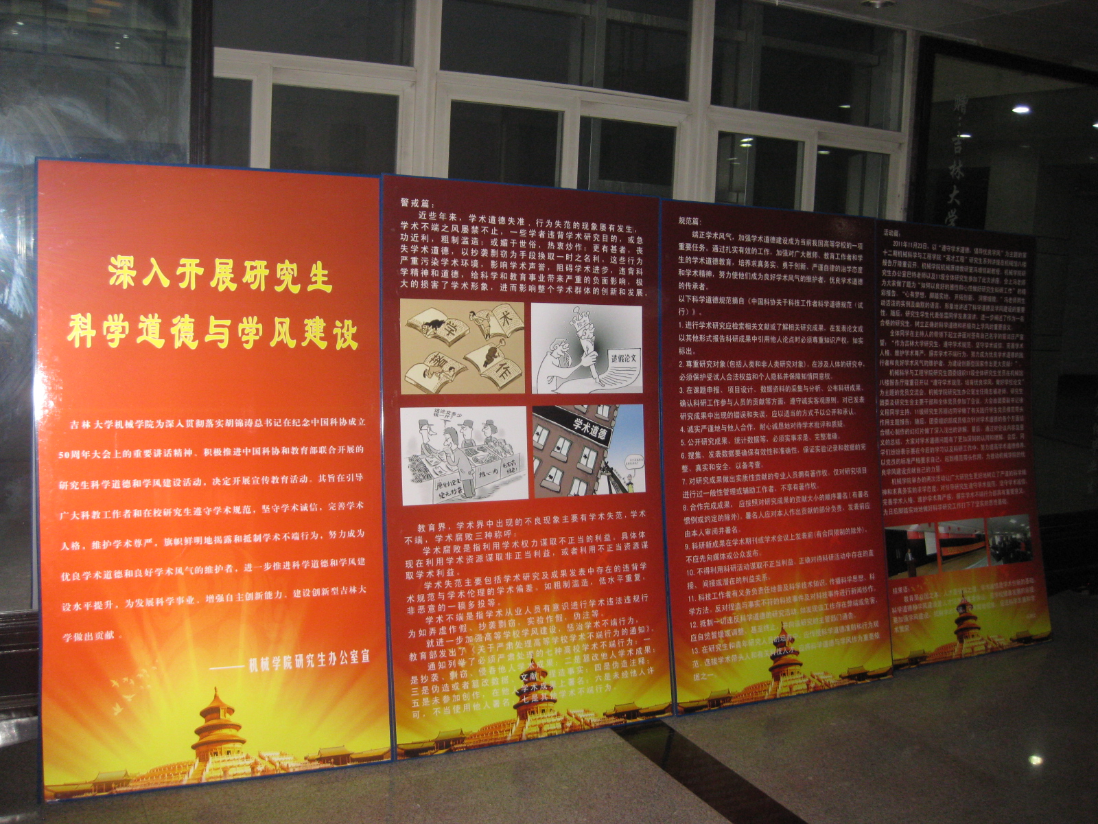 展板内容以文字和图片的形式向我们讲述遵守学术道德的重要意义,并简要回顾了公司此次大型宣传活动的其他内容。从2011年11月起,2011级全体研究生党员召开的以“遵守学术规范,培育优良学风,做好学位论文”为主题的党员交流会、以“遵守学术道德,倡导优良学风”为主题的第十二期机械科学与工程公司“英才工程”研究生系列讲座相继进行,这些活动为广大研究生树立正确的科研价值观,自觉自律遵守学术道德起到了很好的引导和教育作用。