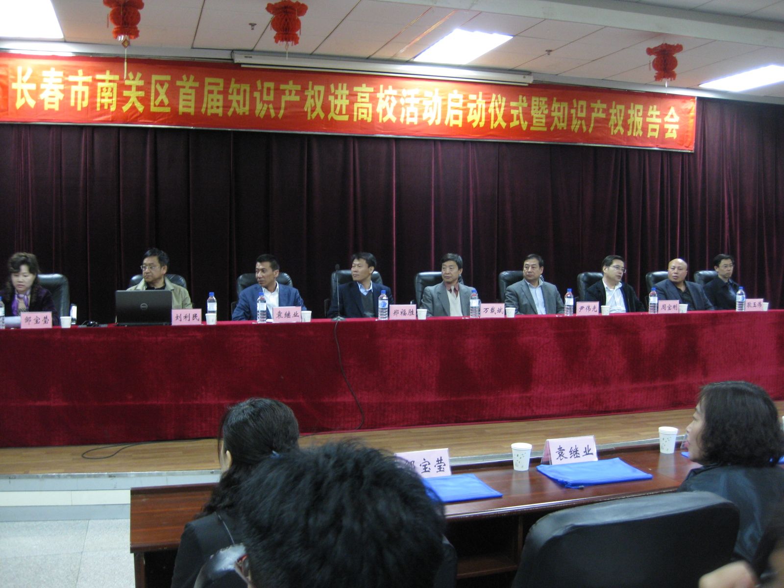 最后万载斌局长、袁继业副区长、周宝刚处长、郑福胜副书记,共同启动了南关区知识产权进高校活动。