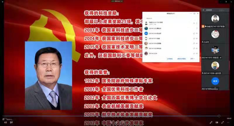 博士生代表张翔为同学们播放了关于闫楚良院士的事迹视频:闫楚良院士长期从事飞机寿命与可靠性科学研究,为大幅度提高中国现役飞机使用寿命和保障飞机安全做出了重要贡献。张瑛老师鼓励同学们学习如闫楚良院士等优秀榜样,将“科研强国,实干兴邦”的精神发扬光大。