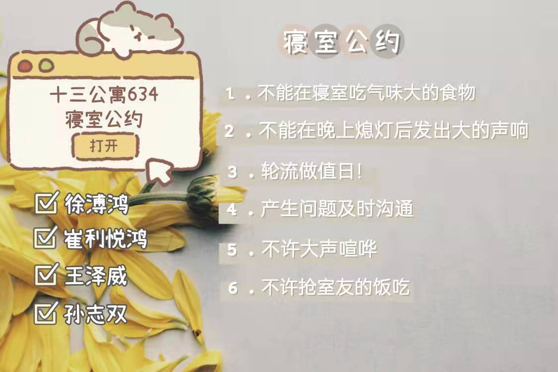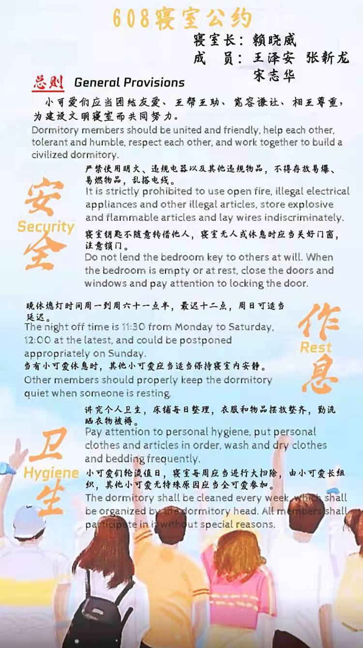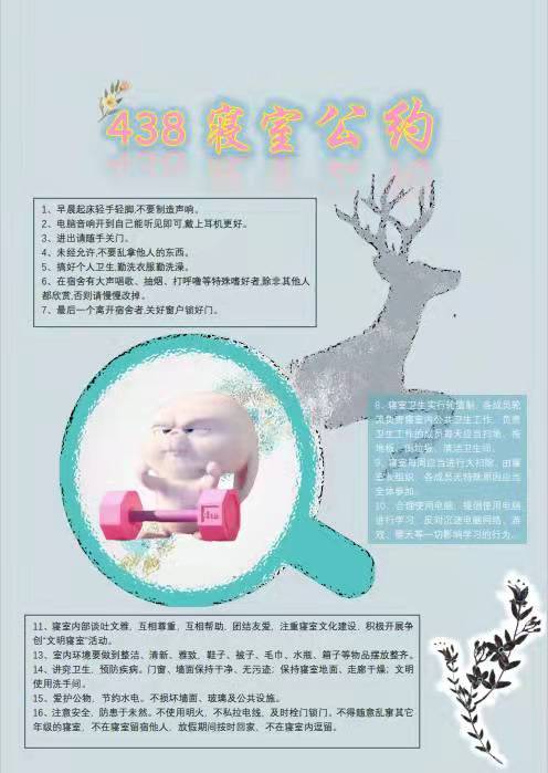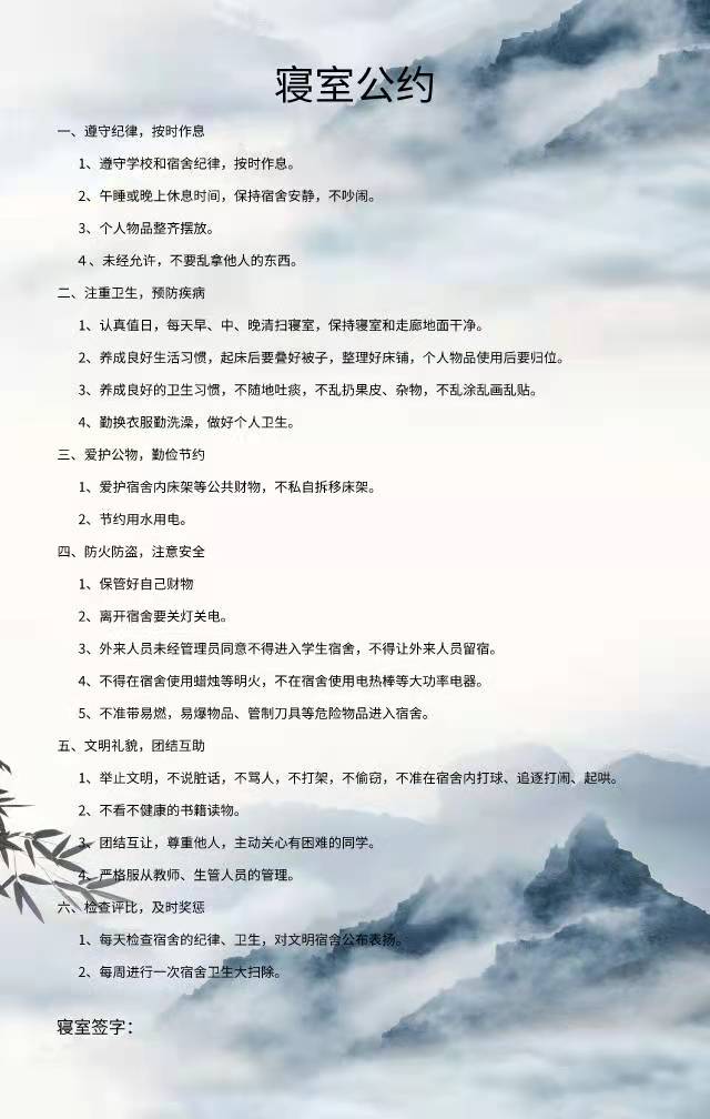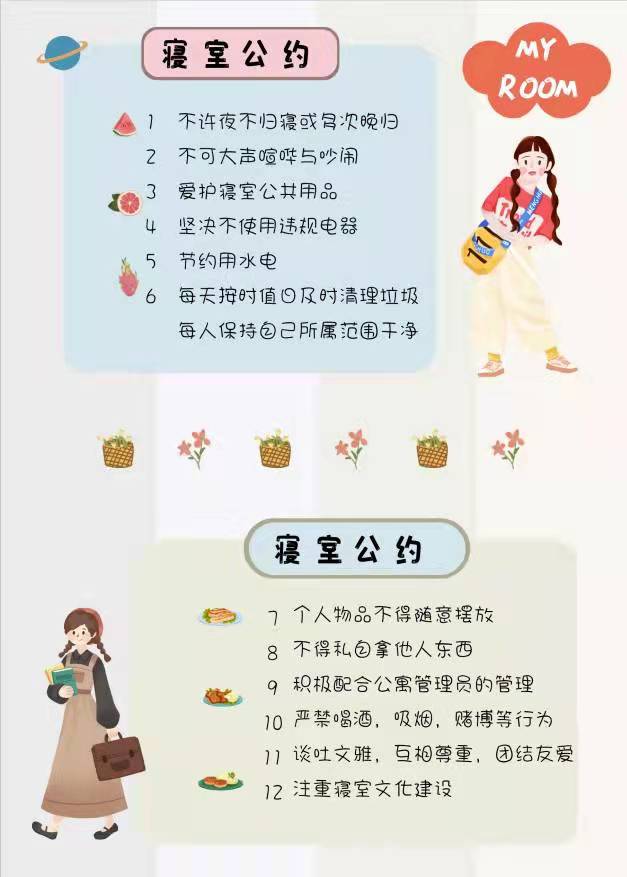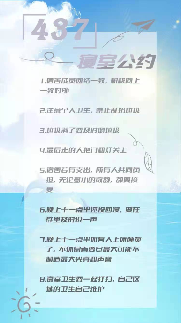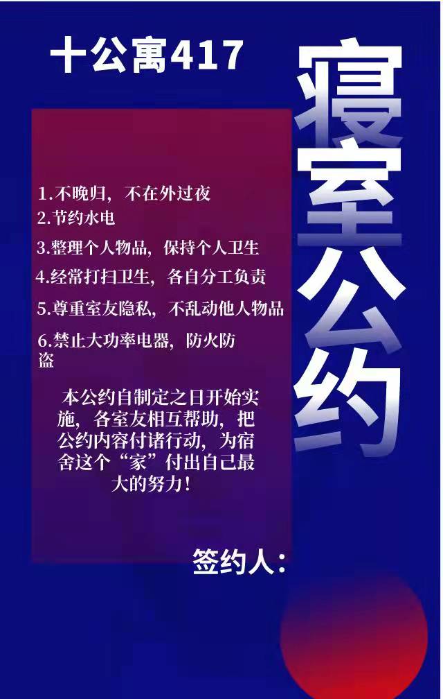 为进一步加强公寓文化建设,发挥公寓育人阵地作用,推动员工寝室制度化、有序化管理,引导员工养成良好的生活习惯,营造文明和谐、干净整洁的寝室文化氛围,公司于10月20-25日开展了全员参与创建寝室文明公约活动。寝室公约是寝室共同居住成员在遵守公司规章制度的前提下,就作息时间、值日制度、寝室安全等方面,经友好协商、普遍认可、自主约定形成的公共准则。组织员工签订寝室公约对促进寝室和谐、减少寝室矛盾、增进同学情谊、增强寝室凝聚力具有重要意义。接下来,公司将统一印制文明公约海报,统一张贴在寝室内,全员签约。希望同学们信守公约,共同创造一个“安全、文明、卫生、和谐”的生活环境!