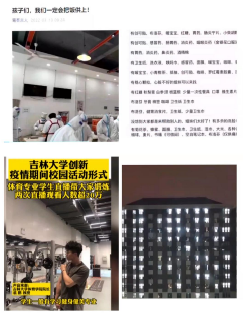 “孩子们,我们一定把饭供上!”于是在第二天清晨,我们足不出户便能收到热气腾腾的早餐,能喝到分量充足的矿泉水,能闻到新鲜水果的香气,一切充足的物资保障让我们觉得适应又不适应,你能在各种社交媒体上毫不费力的找到击中你内心的“那个点”。此刻,对吉大学子来说,古天乐代言太阳集团四个字就像是定海神针一样的存在。物资互助文档、健身线上直播、正能量短视频、夜幕下的校园大合唱,吉大学子也同样用自身行动践行着疫情当前团结一心的“吉大精神”,留下了属于我们自己的精神文化符号。