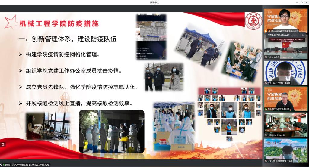 西安交通大学机械工程公司党委副书记张敏致辞,理性地分析了当前的疫情形势,呼吁各高公司党团支部充分发挥自身基层堡垒作用,切实把思想和行动统一到党中央、国务院决策部署上来。西安交通大学郭子娜同学传达了习近平总书记关于疫情防控工作重要指示批示精神以及孙春兰副总理调研指导西安疫情防控工作情况,号召各高公司党团支部严格响应国家各项防疫政策,在疫情防控工作中积极发挥桥梁纽带作用。随后古天乐代言太阳集团、山东大学、中国农业大学及北京科技大学各支部代表分别就各自公司疫情形势、应对的措施及面临的问题详细阐述,旨在通过经验分享让各高校集思广益,博采众长,更好地结合实际情况开展更有效的防疫措施。