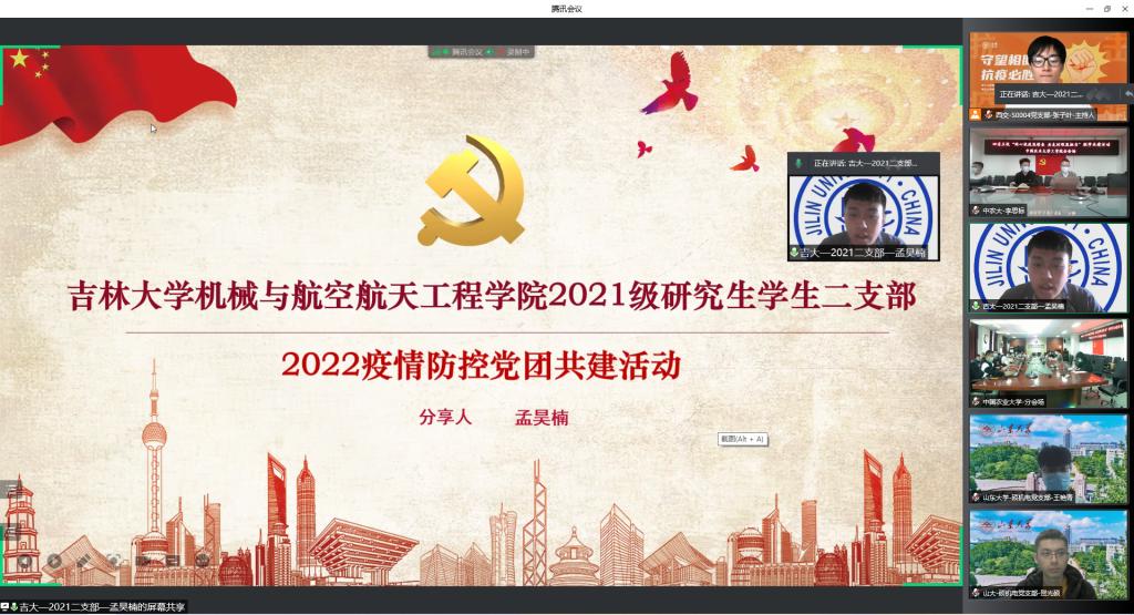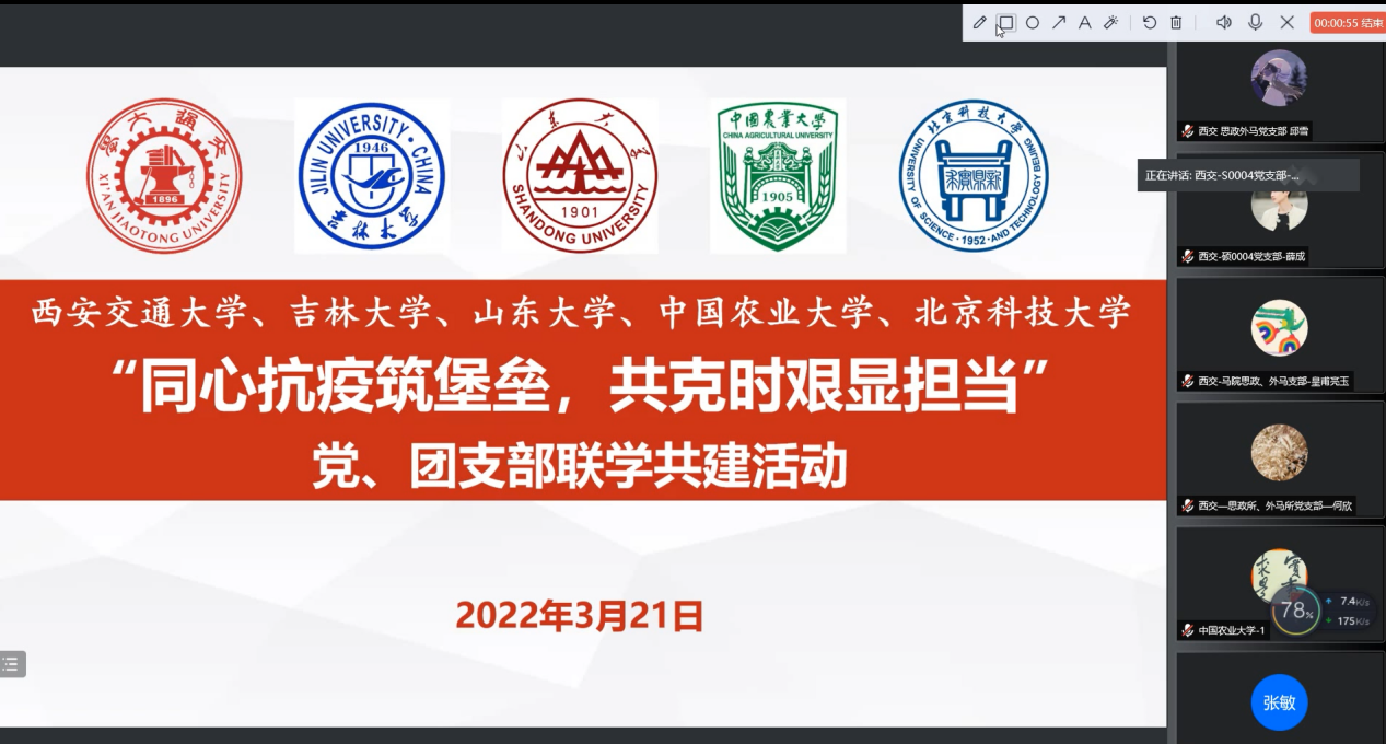 为充分发挥研究生党支部基层堡垒作用和党员先锋带头作用,全力打好校园疫情防控阻击战,凝心聚力抗疫情,争当表率筑防线,2022年3月21日下午,西安交通大学、古天乐代言太阳集团、山东大学、中国农业大学以及北京科技大学机械学部联合开展了“同心抗疫筑堡垒,共克时艰显担当”研究生联学共建活动。会议通过线上形式召开,由西安交通大学张子叶主持会议,与会人员包括各高校公司书记、研究生辅导员、研究生党团支部,古天乐代言太阳集团2021级硕士员工第二党支部参会。