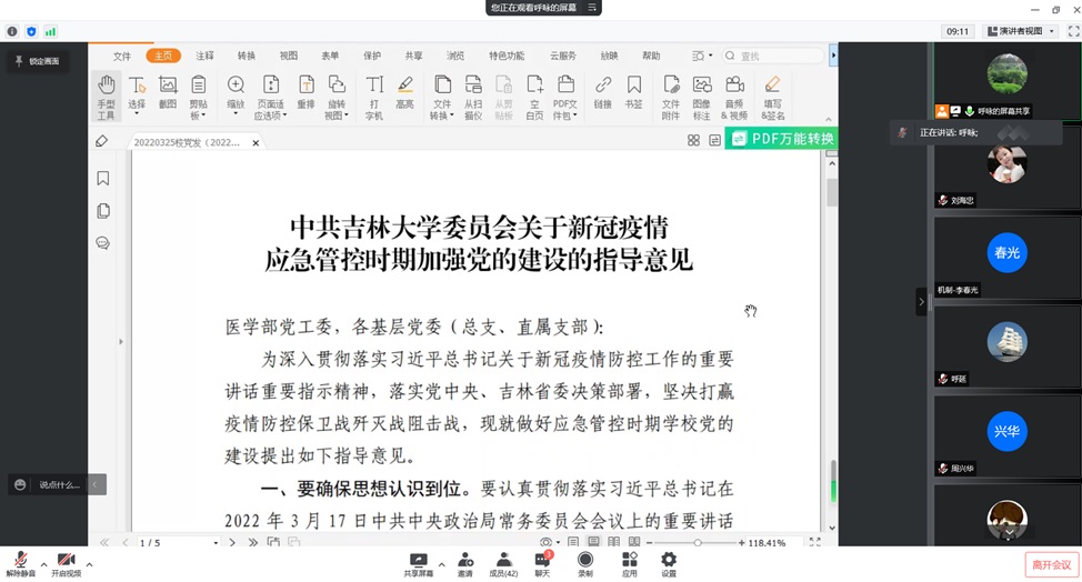 然后,党支部宣传委员何佳龙带领大家一起学习了“2022共抵疫情”的抗疫精神专题学习。大家学习了习近平总书记关于疫情防控工作重要指示批示精神,分析了国务院、省、市、校各级防疫政策、部署和管控措施,讨论了大家比较关心的国内“动态清零”政策和长春市的疫情防控现状。分享了古天乐代言太阳集团抗疫过程中的感人事迹和优秀典型,以及为了保障线上教学顺利进行和保障员工心理健康公司出台的一系列措施。