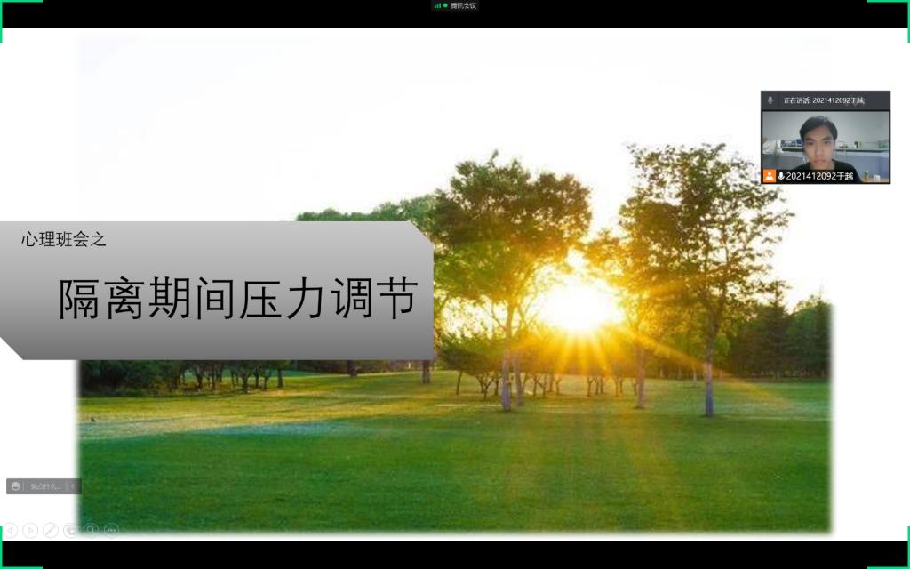 基于封闭管理要求,本次“心理班会”以班级为单位采用线上方式举办。为克服线上班会在策划与实施上的诸多不便,切实提高同学们的心理调节能力,在对各班心理委员进行培训的基础上,围绕心理健康指导中心提供的活动方案,群策群力、集思广益,增加活动的趣味性,以保证活动达到理想的效果。在热身环节后各班同学分别在90分钟的时间里,通过摇摆时钟、情绪安慰剂、不烦躁的理由、我的一天、见证彼此、我的收获等环节察觉和捕捉自己的情绪状态,真诚地表达和分享自身感受。专硕一班还通过故事分享、接龙造句等游戏环节帮助同学们保持愉悦心情,减轻焦虑情绪。力学专业班级在活动的最后选择以歌曲合唱的形式来收尾,让同学们在特殊时期感受到了团体的温暖。