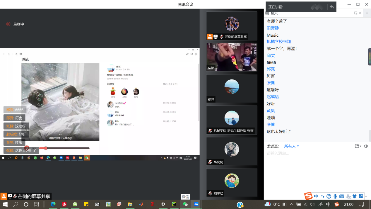 曲艺老师表示,希望同学们能够享受歌声、享受舞台,尽情展示自我风采。选手们按出场顺序开麦唱歌,温柔安静的《忽然之间》、深情感人的《至少还有你》、轻松欢快的《好久不见》等为同学们带来了一场听觉盛宴。分享会还穿插了歌词接龙、听歌识曲等互动环节,同学们踊跃抢答并即兴演绎,敞开心扉,“唱”所欲言。张瑛老师为大家带来歌曲《说谎》,曲艺老师也为大家带来诗朗诵《致橡树》,赢得了观众们的热烈反响。现场气氛活跃,节目精彩纷呈,观众们也积极展示自我,风采无限。最后,21级硕士莫绍鹏获得最佳表演奖,17级博士任壮、20级硕士李柠宇、何禹志、21级硕士张健、赵泽睿获得优秀奖。在合唱《我和我的祖国》的歌声中,分享会落下帷幕。