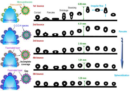 在金属表面上实现主动防冰和高效散热仍然是艰巨的挑战。超疏水性和多次液滴弹跳能力会增加金属表面除冰的可能性,特别是对于动态的表面例如飞机的机翼,液滴的多次弹跳会增加液滴在横向力的作用下离开金属表面的概率。同时,球状液滴成型的能力可以使表面冷凝模式为滴状冷凝,大大提高冷凝换热效率,避免在表面形成一层液膜阻碍冷凝换热。此外,当表面作为能量采集装置,用于吸收下落液滴的撞击动能时,更多的弹跳次数也可以提高能量的收集频率,从而提升能量收集效率。