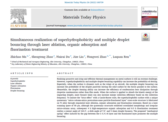 研究工作受国家自然科学基金(51875241)和吉林省重点研发计划项目(YDZJ202101ZYTS129)的资助。相关论文“Simultaneous realization of superhydrophobicity and multiple droplet bouncing through laser ablation, organic adsorption and fluorination treatment”发表在知名学术期刊Materials Today Physics上。赵宏伟教授和马志超教授为论文的共同通讯作者,工程仿生教育部重点实验室任露泉院士给予了理论指导,马志超教授为论文的第一作者。