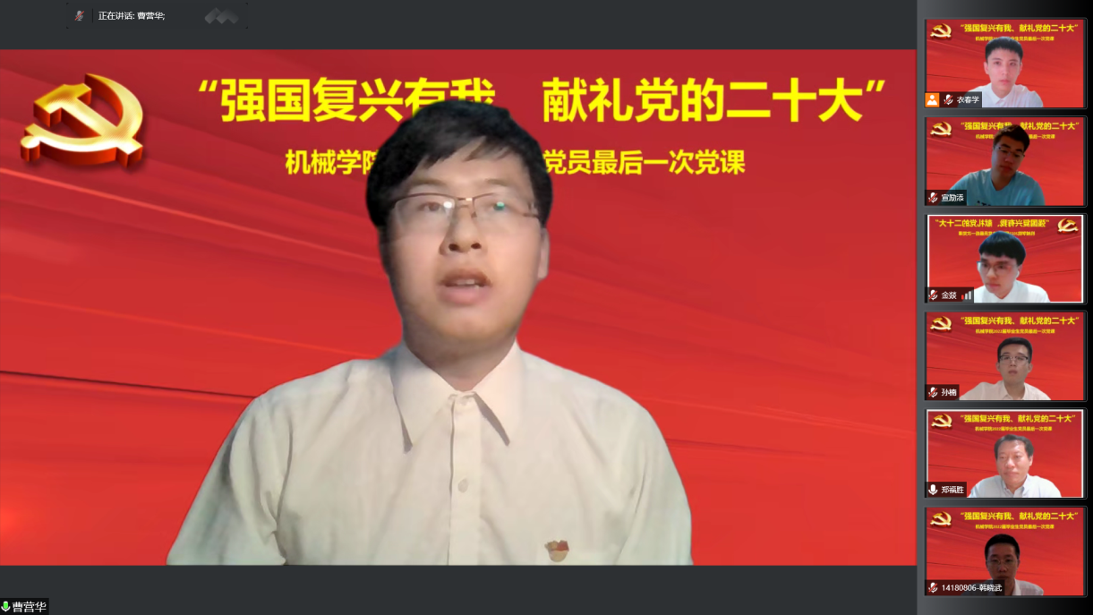 毕业生党员代表曹营华、金燚等同学也分享了在党课中的收获和感悟。他们表示,通过本次党课学习,再一次为黄大年精神所鼓舞,更深刻意识到作为党员身上肩负的重任。今后的道路上,一定坚定不移地跟党走,切实把个人价值定位在爱国主义基础之上。以黄大年为榜样,努力学习,把报效祖国作为学习动力,在为国家和人民奉献的过程中实现自己的人生价值。