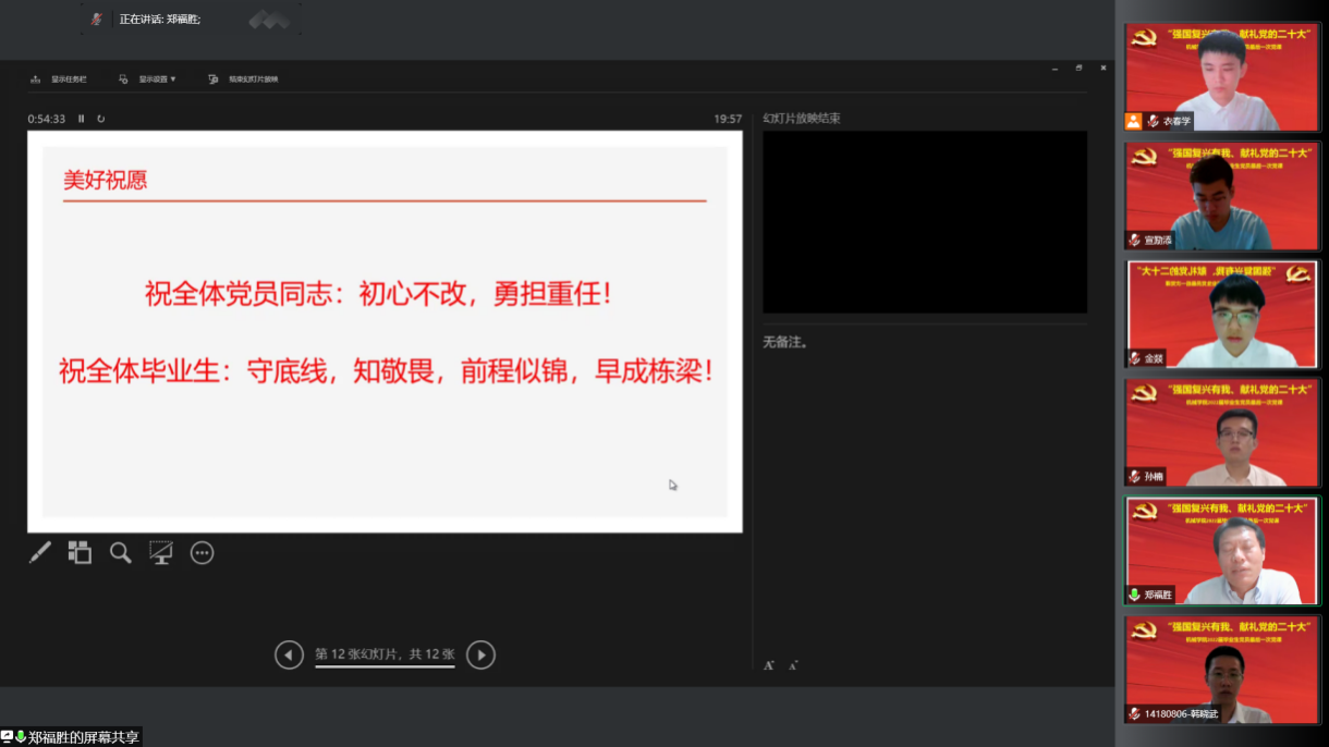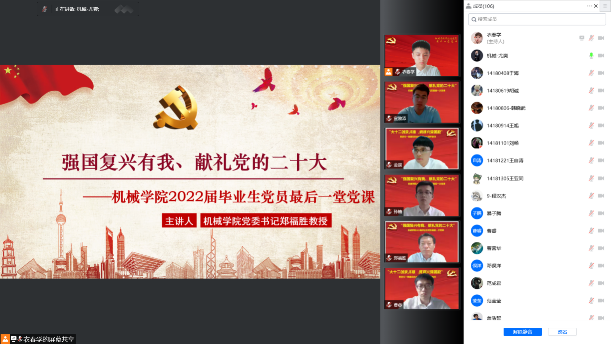 最后,郑书记祝愿全体毕业生党员胸怀天下、勇担重任,守底线、知敬畏,前程似锦,早成栋梁。