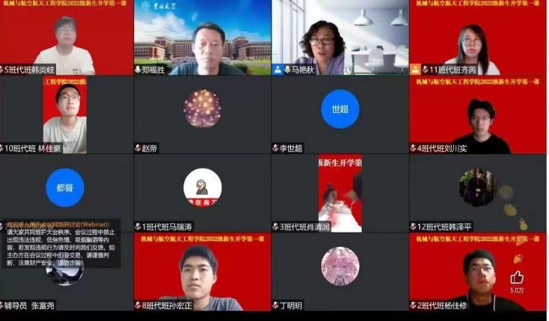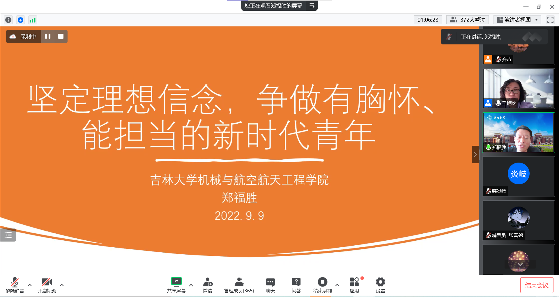 2022年9月9日下午,古天乐代言太阳集团线上举行了2022级新生“开学第一课”主题活动。机械与航空航天工程公司党委书记郑福胜、党委副书记兼副经理马艳秋、员工工作办公室全体辅导员老师、2022级全体新生辅导员助理以及全体2022级新生参加本次活动。会议由党委副书记兼副经理马艳秋主持。