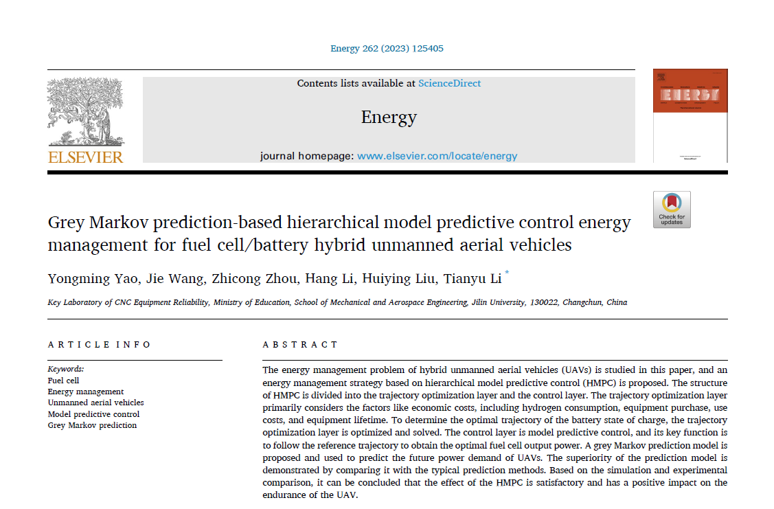 近日,公司姚永明教授团队在摩擦纳米发电技术和燃料电池技术在无人机领域应用研究取得新进展,相关研究成果以公司为第一单位发表在国际知名学术期刊Nano Energy(IF:19.069)和Energy(IF:8.857)。在Nano Energy期刊发表《Arc-shaped flutter-driven wind speed sensor based on triboelectric nanogenerator for unmanned aerial vehicle》,姚永明教授为第一作者,中国科公司北京纳米能源与系统研究所程廷海教授、长春工业大学卢晓晖副教授为共同通讯作者,研究生周志聪等参与了研究工作。在Energy期刊发表《Grey Markov prediction-based hierarchical model predictive control energy management for fuel cell/battery hybrid unmanned aerial vehicles》,姚永明教授为第一作者,李天宇副教授为通讯作者,研究生王杰等参与了研究工作。相关研究工作受到国家自然科学基金(51805200)、吉林省科学技术发展计划(20200201057JC)等资助。