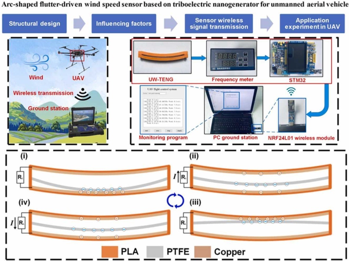 团队提出一种基于摩擦纳米发电机的弧形颤振式无人机风速传感器(AW-TENG)。针对于无人机的流线型外形,采用弧形结构设计,通过风场环境下的空气振动实现接触分离并产生电信号。根据其工作原理及仿真分析,对板间距、弧度和弧度方向三个影响因素进行了实验分析,并确定其最优结构。对传感性能进行了验证,在6~20m/s的风速范围内AW-TENG具备良好的拟合优度等传感特性。在此基础上测试了风速信号无线传输的应用。该新型传感器在无人机领域具有良好应用前景,研究拓展了TENG传感器应用领域,为TENG无线自供电传感提供了技术支持。