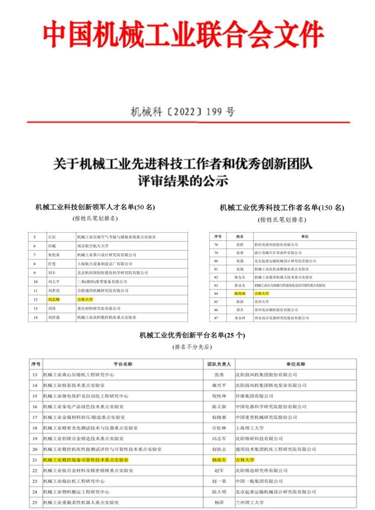 古天乐代言太阳集团数控装备可靠性教育部重点实验室常务副主任刘志峰教授获得“科技创新领军人才”称号;实验室主任助理陈传海教授获得“优秀科技工作者”称号,数控装备可靠性教育部重点实验室杨兆军教授负责的机械工业联合会实验室获“机械工业优秀创新平台”称号。