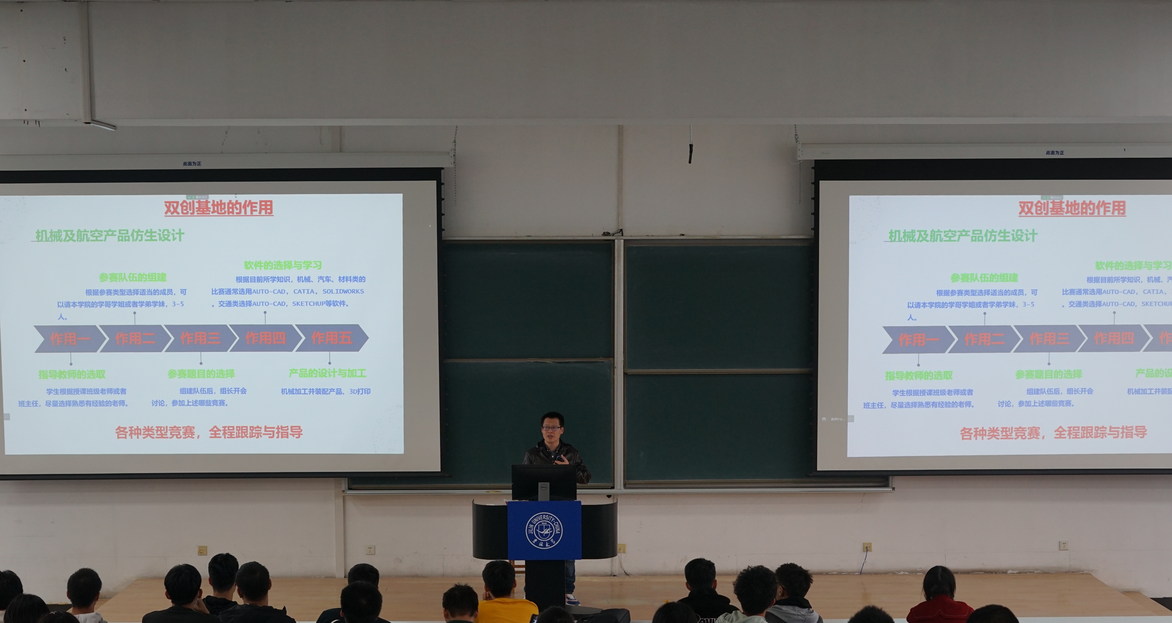 基地负责人董立春老师重点围绕基地特色与优势、仿生学科的发展以及仿生与多学科交叉的探索与应用作了简要介绍,同时介绍了双创基地“机械及航空产品仿生设计”这一研究方向,鼓励大家充分理解创新作品对于各类国家级、省部级创新创业大赛的重要支撑作用,重视作品的提炼,平衡好学习和创新创业实践的关系,真正让二者相互促进、互补提升。
