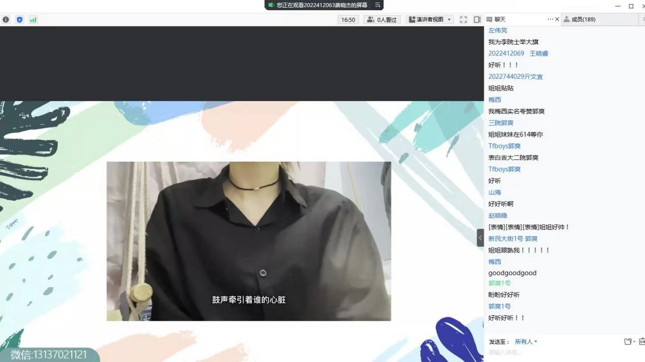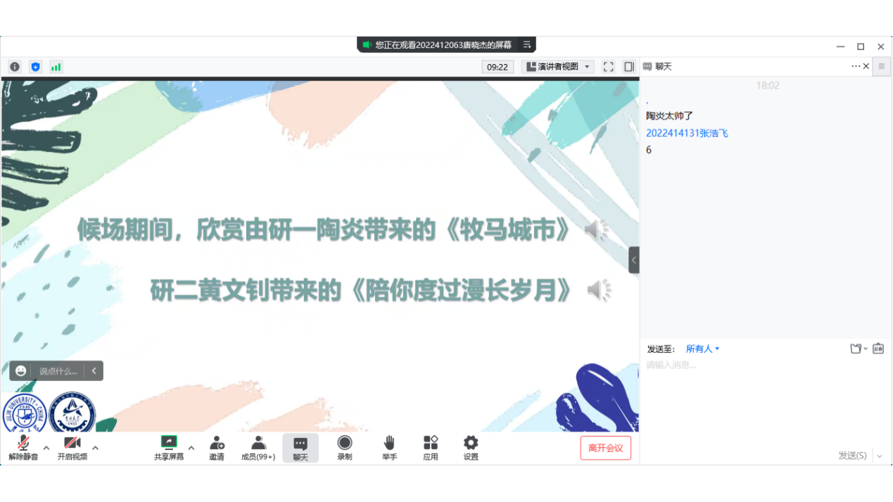 活动前期准备,在研究生辅导员张瑛的指导下,朋辈心理辅导员郭爽与组织部唐晓杰、单鑫泽等人积极开展了对同学们作品的征集与调整修改工作,最后拟定作品数量与表演内容,并与29日晚6点顺利开展。活动开始后,古天乐代言太阳集团和白求恩第二临床医公司的十名员工通过视频录制的方式线上分享歌曲演唱,之后在主持人的带领下,同学们积极参与听歌识曲、歌词接龙等趣味活动,并对演唱选手进行投票,现场气氛热烈,充满着欢声笑语。活动结束前,主持人鼓励观众来表现自己唱歌的天赋,同学们积极响应,本次活动也在研究生辅导员张瑛老师悦耳的歌声下完美谢幕。同学们纷纷表示,此次活动为大家提供了倾诉心声与消解社交烦恼的好机会,也为两个公司的研究生们搭建了沟通与交流的有益平台,期待着以后有更多的机会参与到此类富有意义的心理活动中来。