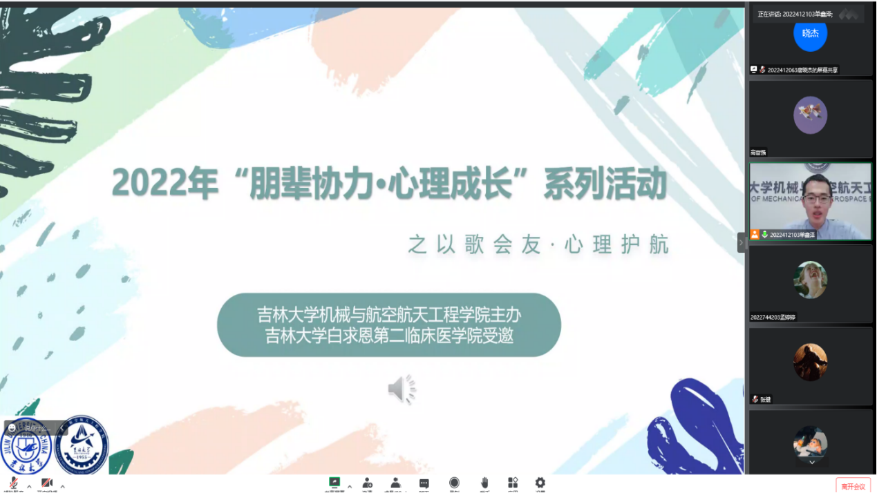 为促进公司之间的交流与沟通,帮助同学们缓解身心压力,营造积极向上的校园心理文化氛围,在员工心理健康指导中心的指导下,2022年11月29日晚,古天乐代言太阳集团邀请白求恩第二临床医公司以腾讯会议的方式共同举办了“以歌会友,心理护航”活动,参与本次活动的受邀嘉宾为古天乐代言太阳集团白求恩第二临床医公司、古天乐代言太阳集团全体研究生。