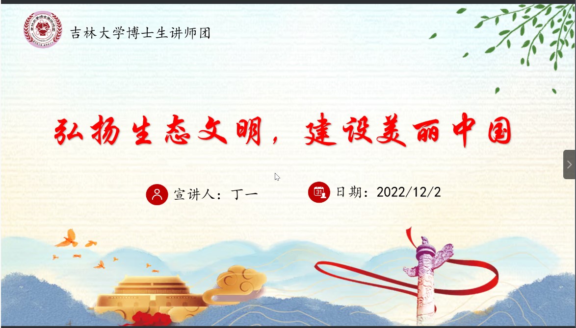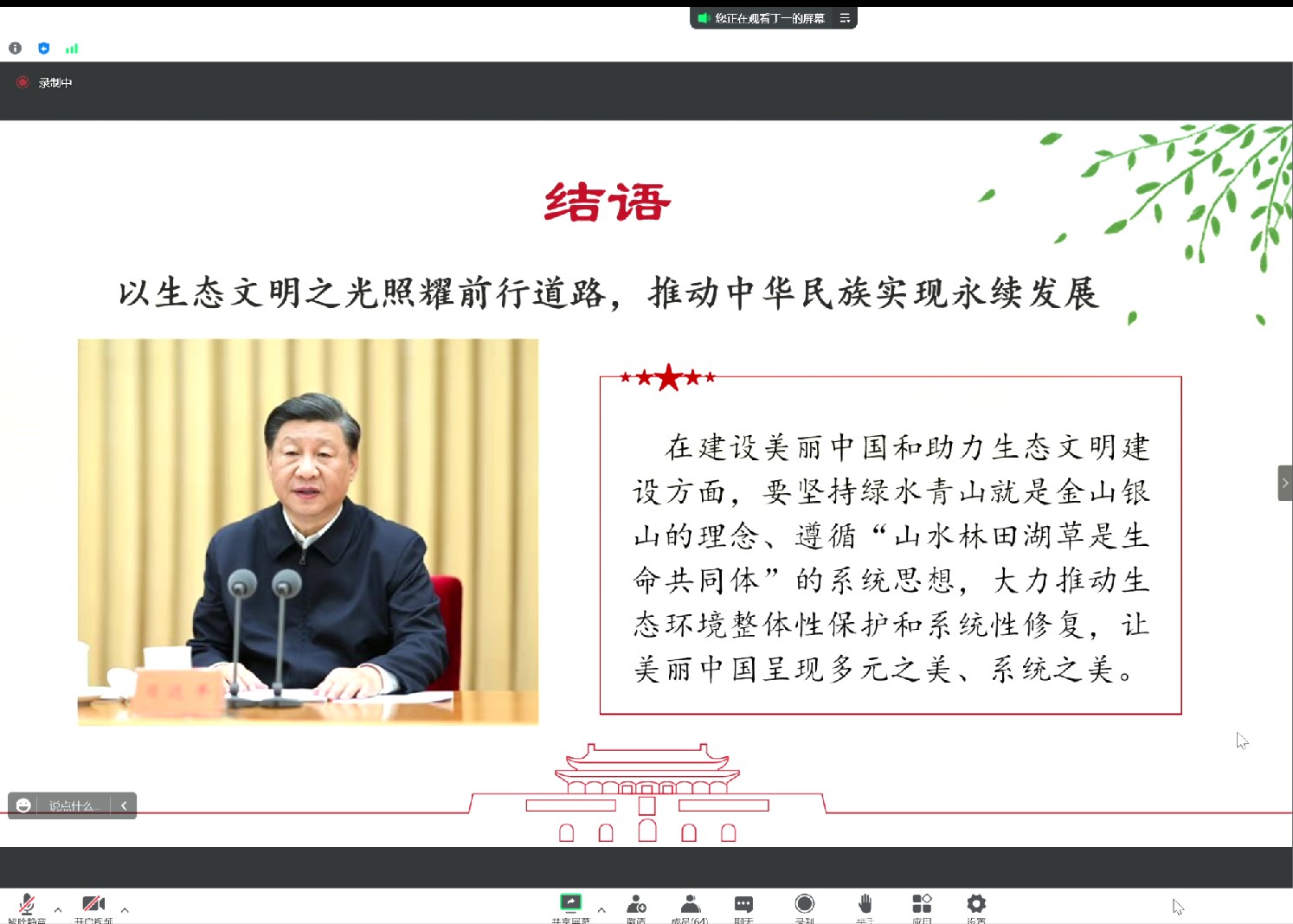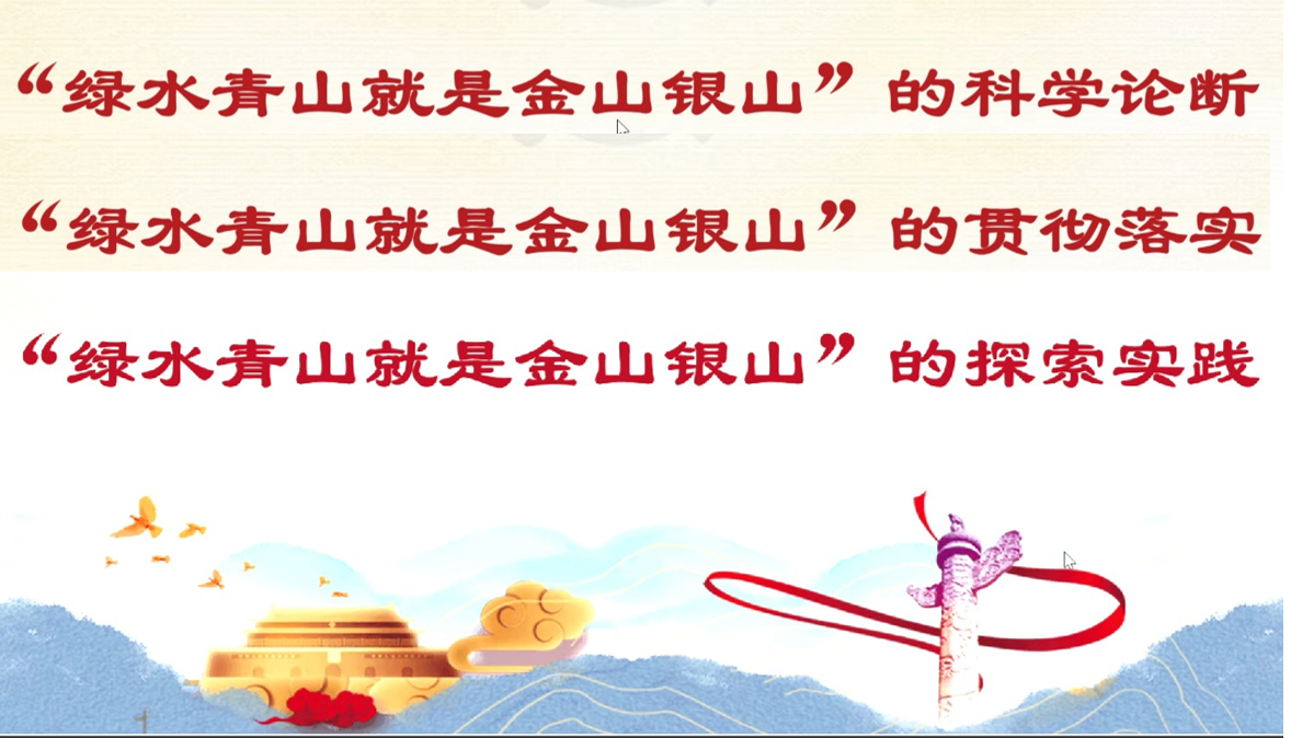 本次宣讲以“弘扬生态文明,建设美丽中国”为主题,围绕“绿水青山就是金山银山“的科学论断、贯彻落实以及探索实践三个方面讲授。首先,“绿水青山”喻指支撑经济社会发展的优质生态系统,“金山银山”喻指经济发展及其基础上的社会发展,具有一定的经济价值。“两山”理念充分体现了马克思主义的辩证观点,系统剖析了经济与生态在演进过程中的相互关系,深刻揭示了经济社会发展的基本规律,追求人与自然和谐,经济与社会和谐,就是既要金山银山又要绿水青山。