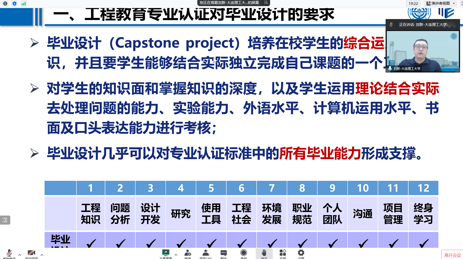 刘新教授从工程教育专业认证对毕业设计的要求、毕业设计的思考、毕业设计管理与指导工作等几方面做了报告。主要介绍了毕业设计要求员工有综合运用所学知识并独立完成课题的能力、理论结合实际能力、实验能力、外语能力、计算机运用及书面和口头表达能力;介绍了教师如何考核员工的毕业能力指标点、如何对毕业设计评价打分、如何保证指导与质量。