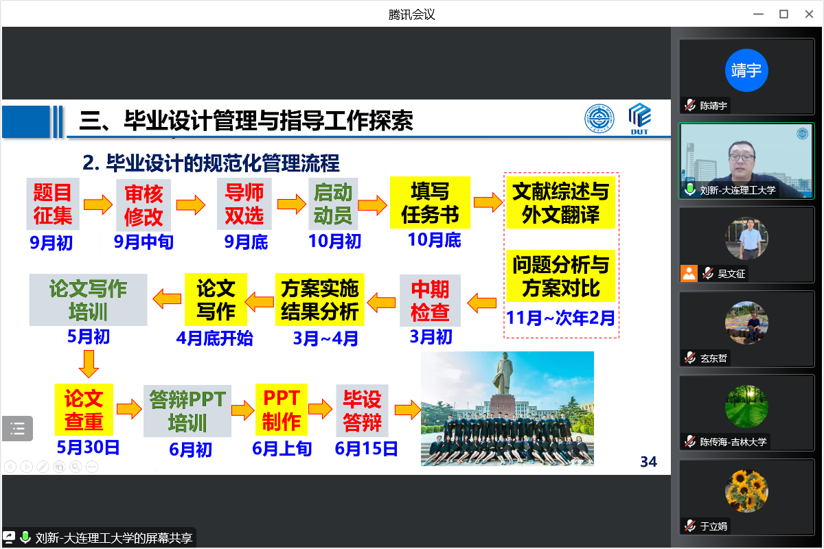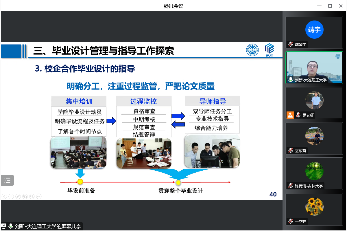 刘新教授分享了如何在有限时间内完成人才培养和科学研究的同时高质量开展毕设指导的经验,提出要设计符合专业认证要求的毕业设计打分表与毕业设计的规范化管理流程,对校企合作毕业设计作出指导,介绍要校企协同、明确分工、注重过程监管、严把论文质量,体会工程伦理的情感价值和大工程观的社会意义;还介绍了教师在指导员工毕业设计时要多与员工交流、利用博士-硕士-本科生的传帮带提高效率、实施集中培训和分散指导保证毕业设计底线等多方面经验。最后,参会教师对报告内容进行了热烈探讨与交流。