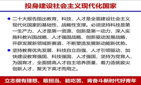 赵宏伟以《坚定理想信念,提高能力素养,努力做社会主义现代化国家的建设者和接班人》为题,强调学习党的二十大精神的重要意义,围绕“科教兴国战略、人才强国战略、创新驱动发展战略”,着重阐释了教育、科技、人才之间的内在联系。他强调,青年员工要全面准确学习领会党的二十大报告及习近平总书记在二十届一中全会上的重要讲话精神,坚定理想信念、学好本领、打牢基础,将个人前途与国家命运紧密相连,为实现第二个百年奋斗目标贡献青年力量。同时,他提出三点希望:一是希望同学们能立志做有理想、敢担当、能吃苦、肯奋斗的新时代好青年,投身到建设社会主义现代化国家的伟大进程中去;二是希望同学们学史明理、学史增信、学史崇德、学史力行,在献身中华民族伟大复兴的伟业中成就个人理想;三是希望同学们把握机械工程学科发展方向,珍惜时光,找到正确方法,做好发展规划,提升思维方式,在行动中磨砺自我,依靠学习走向未来。