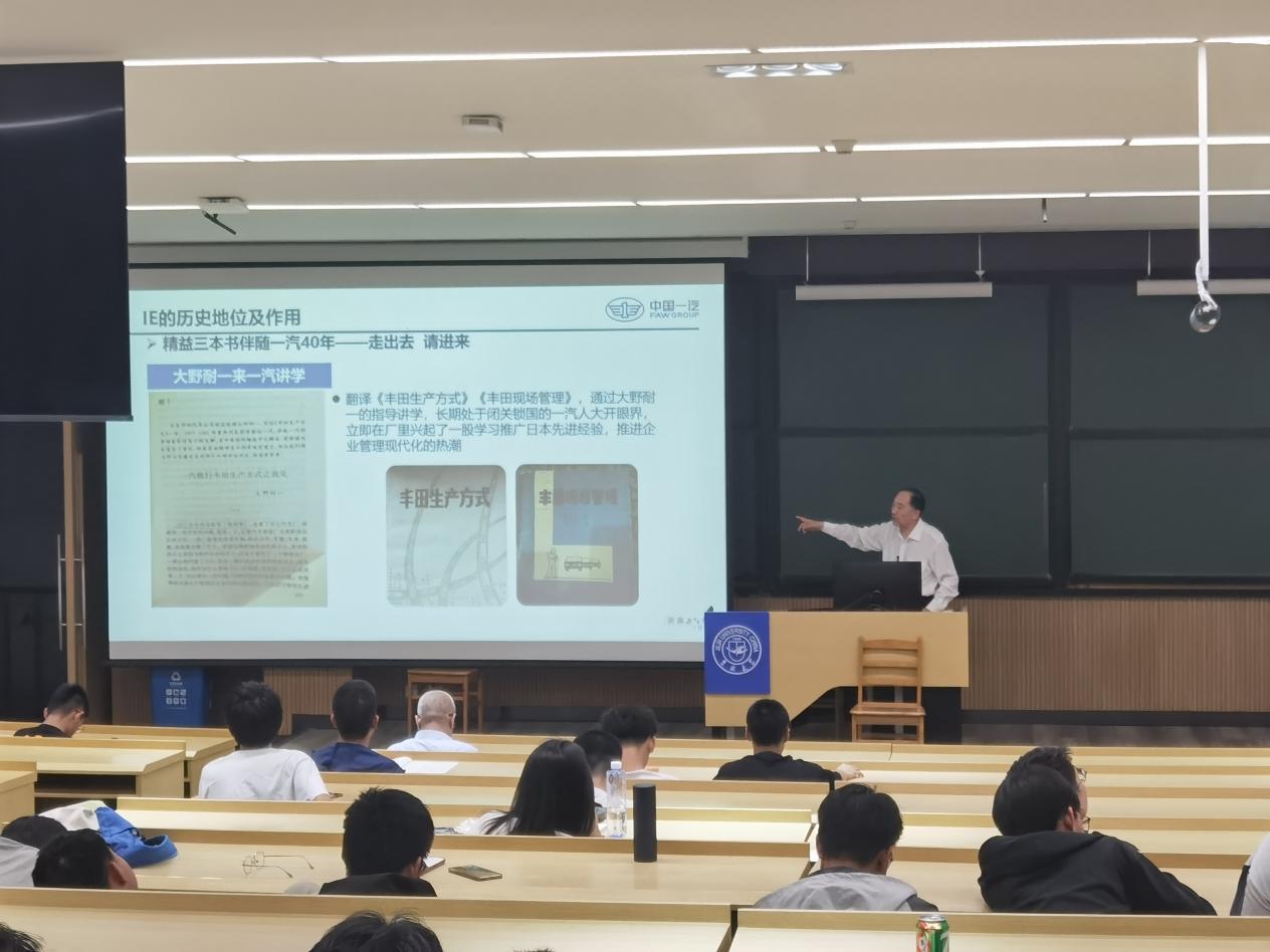 会上,汪玉春老师通过回顾自己中国一汽集团推行精益生产的45年历程,向同学们讲解了IE生产在企业中的重要地位及其广泛应用。汪老师从《丰田生产方式》、《改变世界的机器》、《精益思想》这三本书中提炼出的重要内涵,并将其融会贯通、相互作用,形成了一套可应用于实际操作的精益生产系统;汪老师以一汽IE生产实践和应用为例,介绍了汽车企业在生产、物流、设备、工艺、质量、成本、现场、人才育成等方面的精益体系建设;最后,汪老师通过精益理念、思维、方法的总结,告诉同学们要坚定走IE之路,用更多先进的IE知识来武装自己。