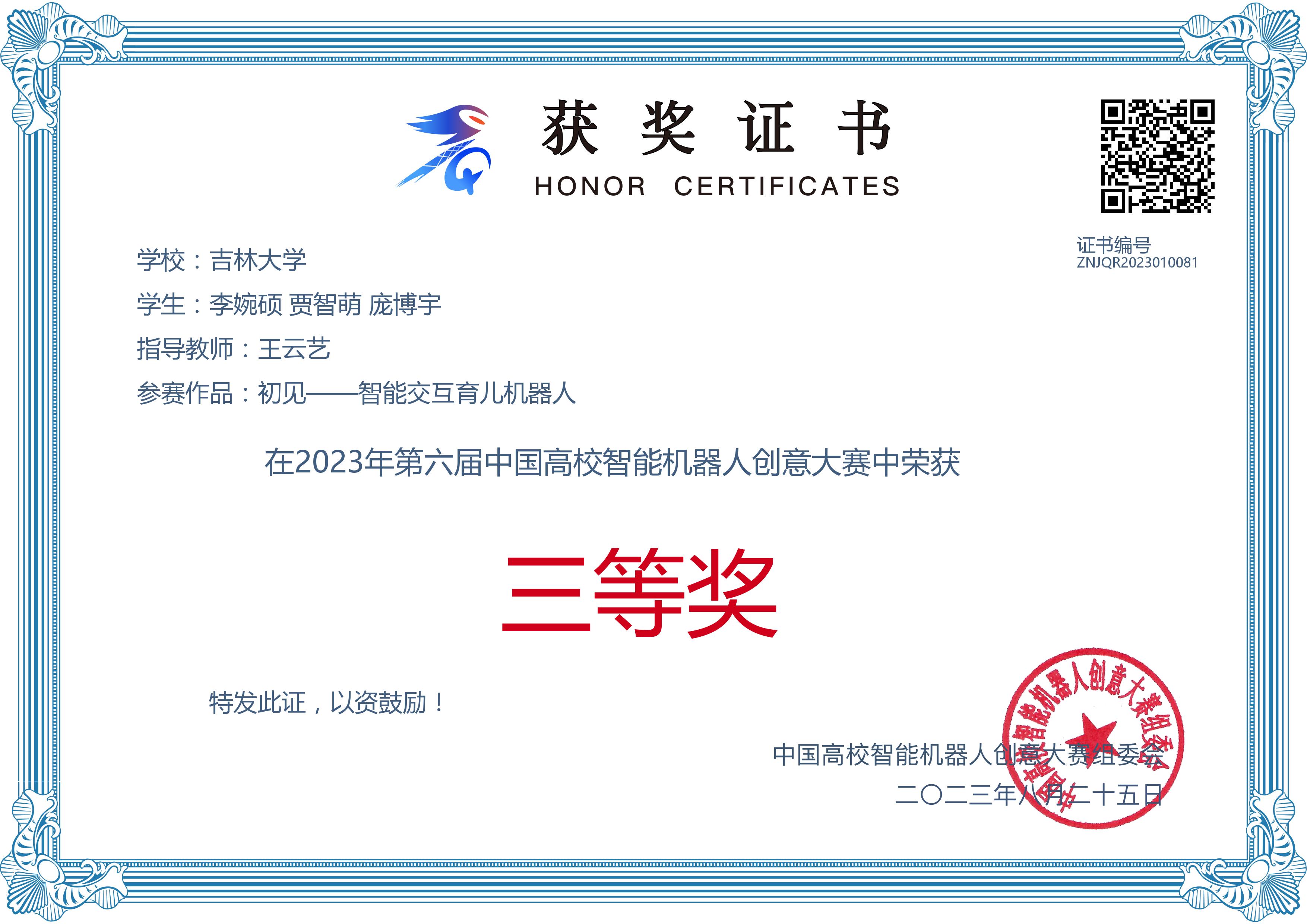 李婉硕,贾智萌,庞博宇以“初见——智能交互育儿机器人”为题勇夺家用智能机器人无实物组全国三等奖。