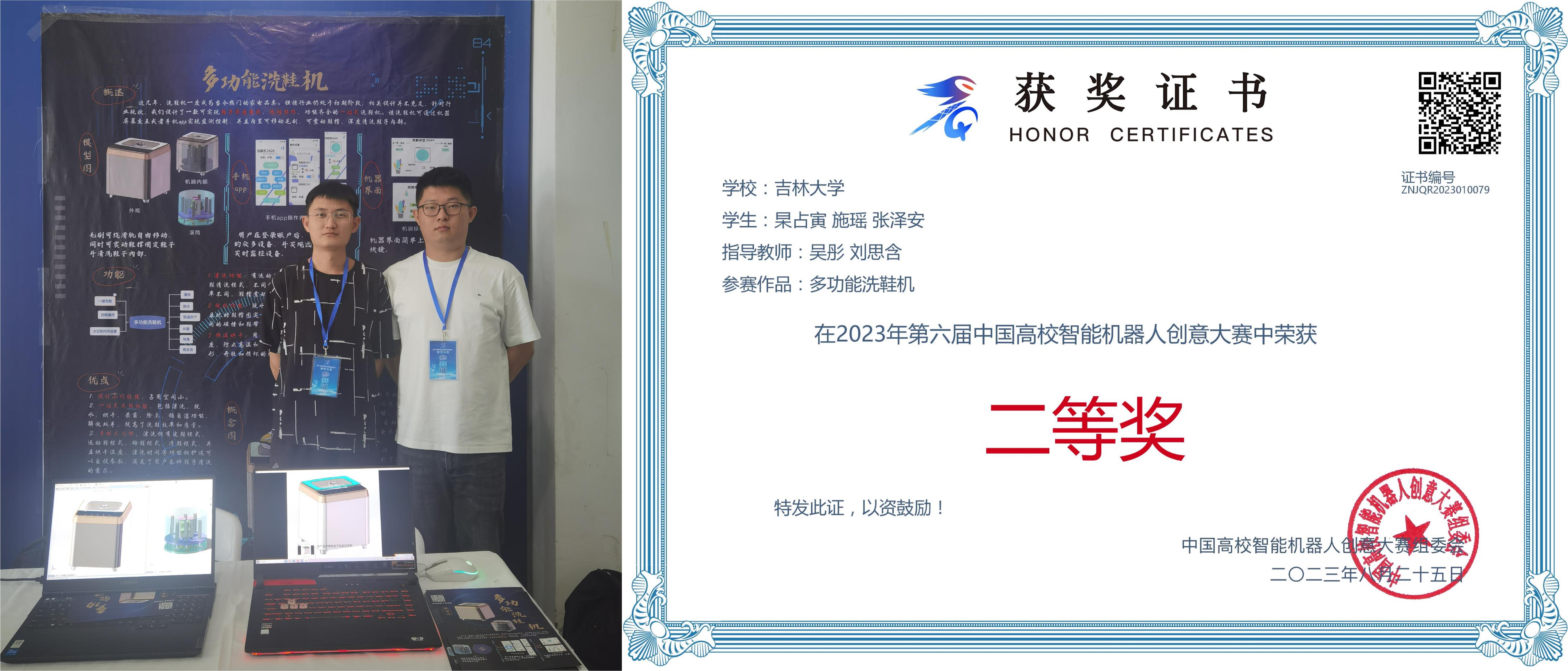 杲占寅、施瑶、张泽安以“多功能洗鞋机”为题勇夺家用智能机器人无实物组全国二等奖。