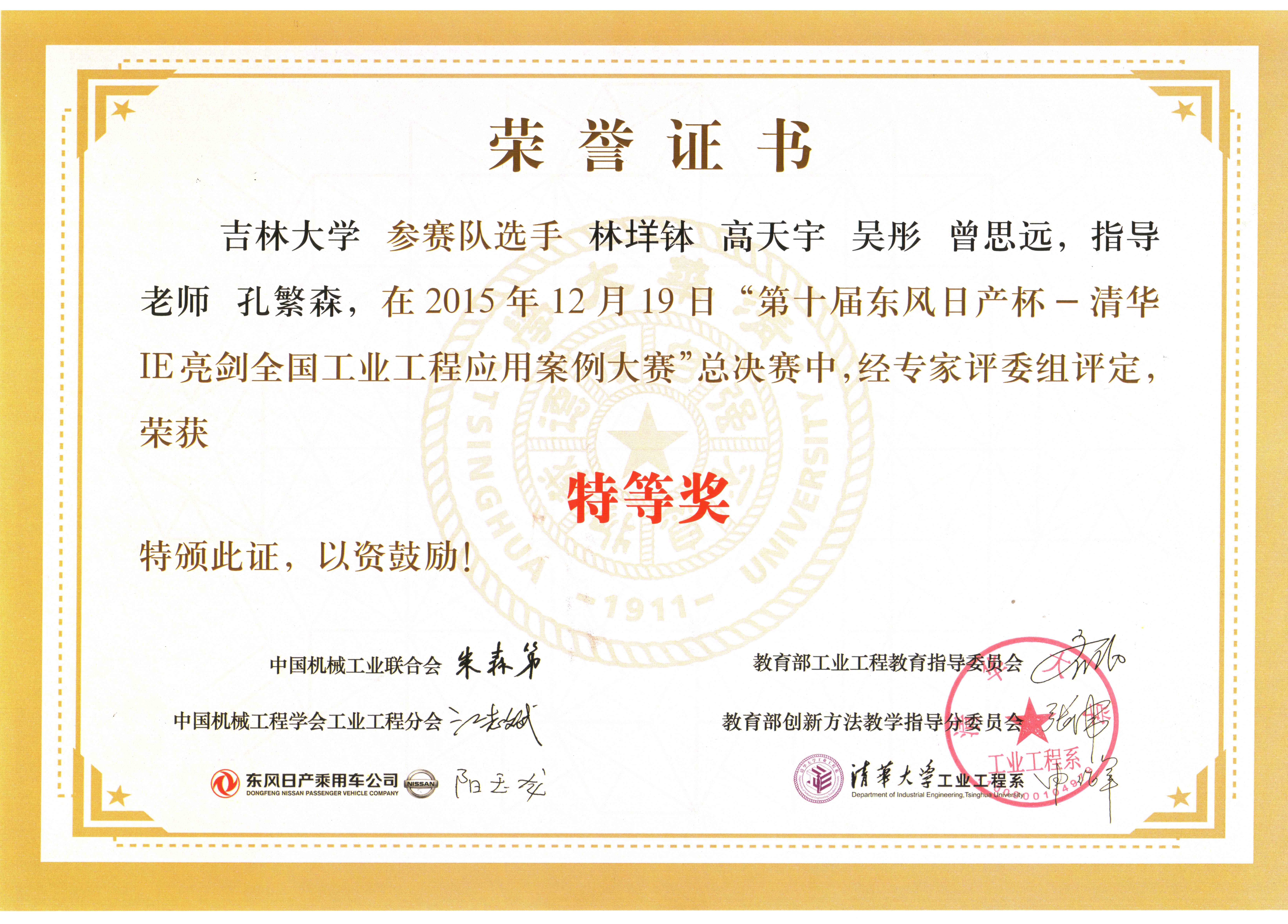 在工业工程系孔繁森老师的指导下,由林垟钵、高天宇、吴彤及曾思远组成的参赛队以“某车桥生产企业减速器装配线的改善与优化”案例与清华大学、上海交通大学、西南科技大学、华中科技大学以及西安交通大学等9支高校参赛队和10支企业参赛队一起晋级了总决赛。经过三天激烈的角逐,最终公司工业工程代表队不负重望,荣获特等奖。
