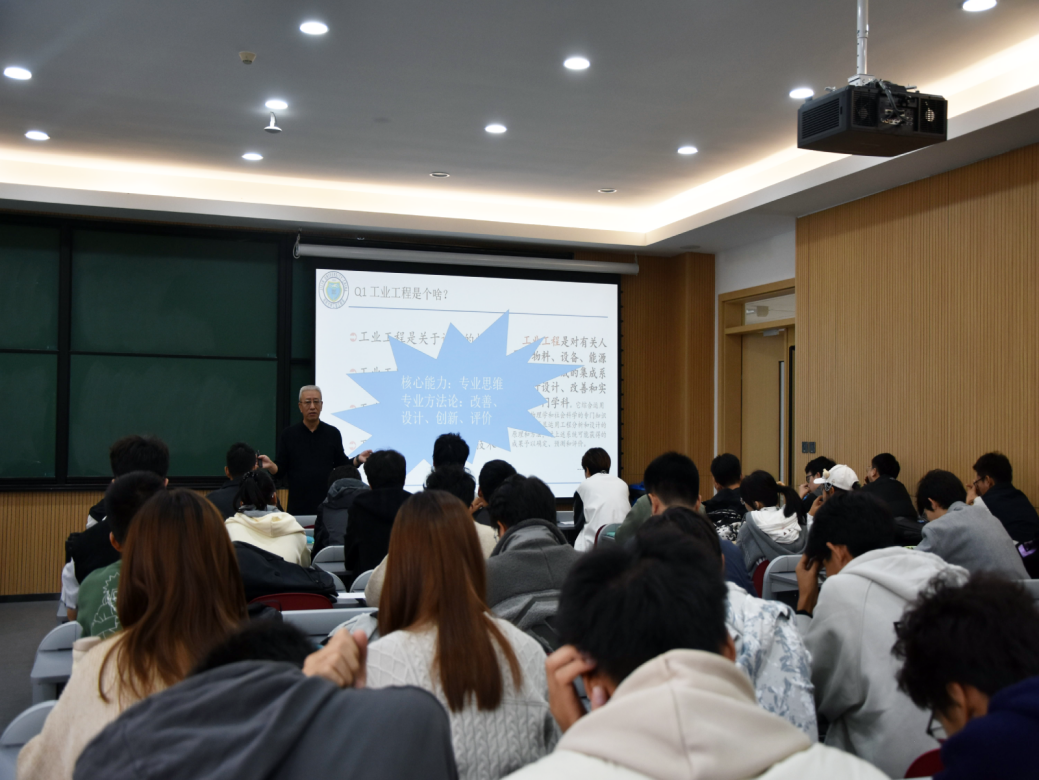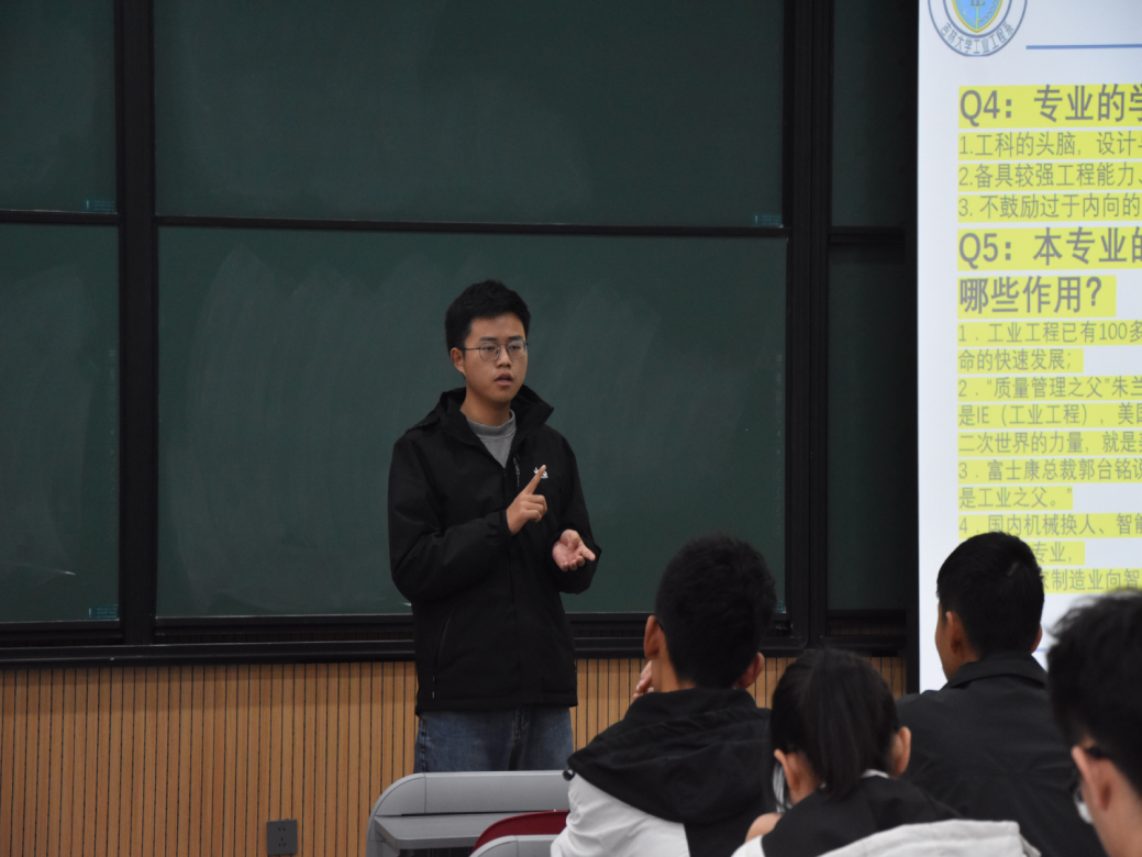 首先,孔教授为同学们讲解了工业工程专业的课程规划,解读了工业工程应有的模型思维、创新性思维、数据性思维、系统性思维等思维结构。接着,他从“工业工程是什么”、“工业工程学什么”和“工业工程的员工将来干什么”三个方面向同学们详细地介绍了工业工程的专业定位、教学人物以及社会职能,从而使同学们了解了工业工程专业的就业情况。然后,孔教授向同学们介绍了四位本专业研究生学优导师,分别是单鑫泽、李佳霖、叶晓文、丁登航。四位学优导师向同学们传递了自己一路走来的学习经验以及心路历程,并对同学们表达了真挚的祝福。在活动的最后,孔老师表达了对同学们真诚的祝愿以及殷切的期许。