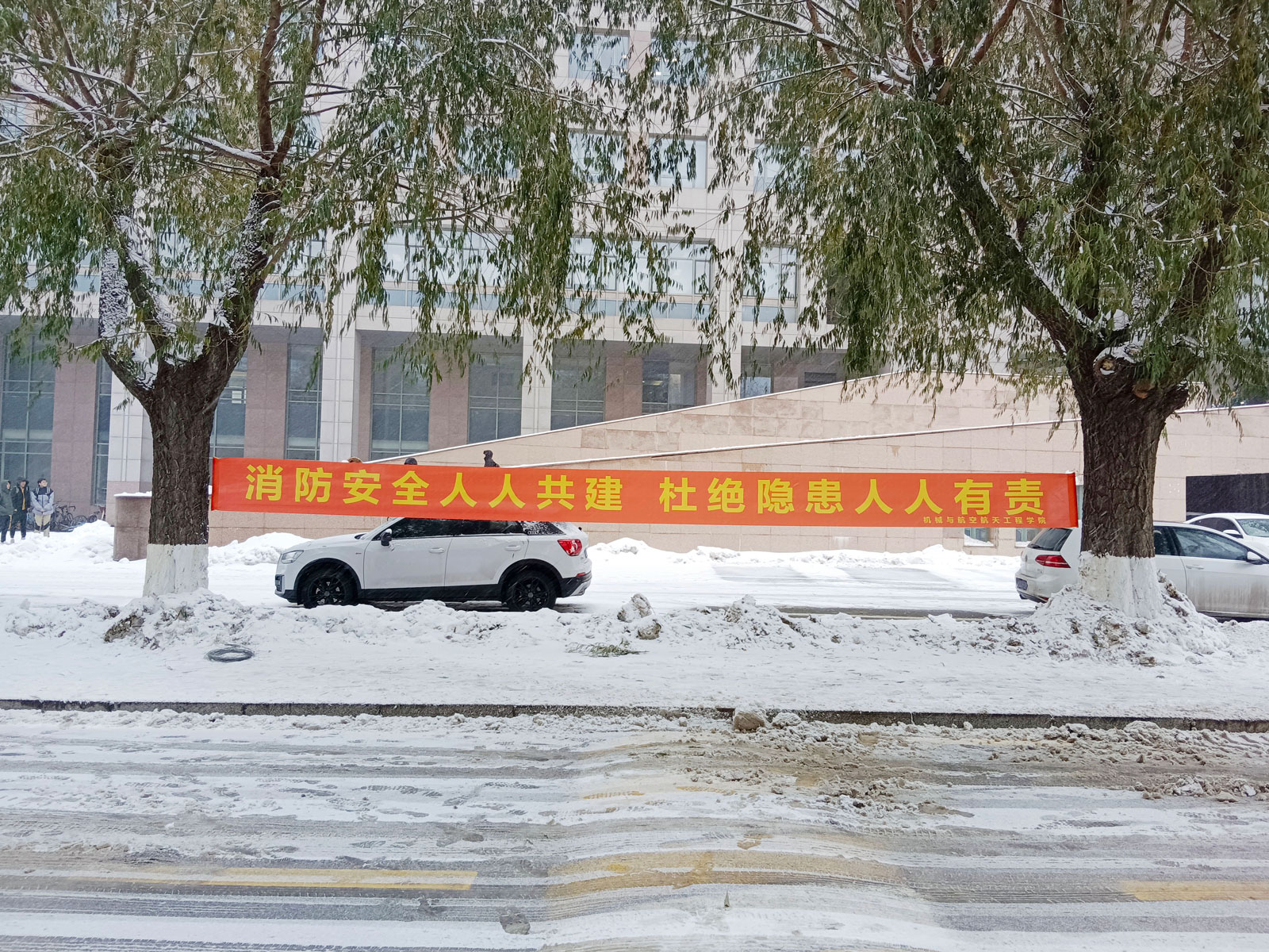 此外,公司还在机械材料馆和逸夫教育大楼前悬挂消防标语横幅,营造出浓厚的消防宣传氛围,提醒师生时刻保持消防安全意识。