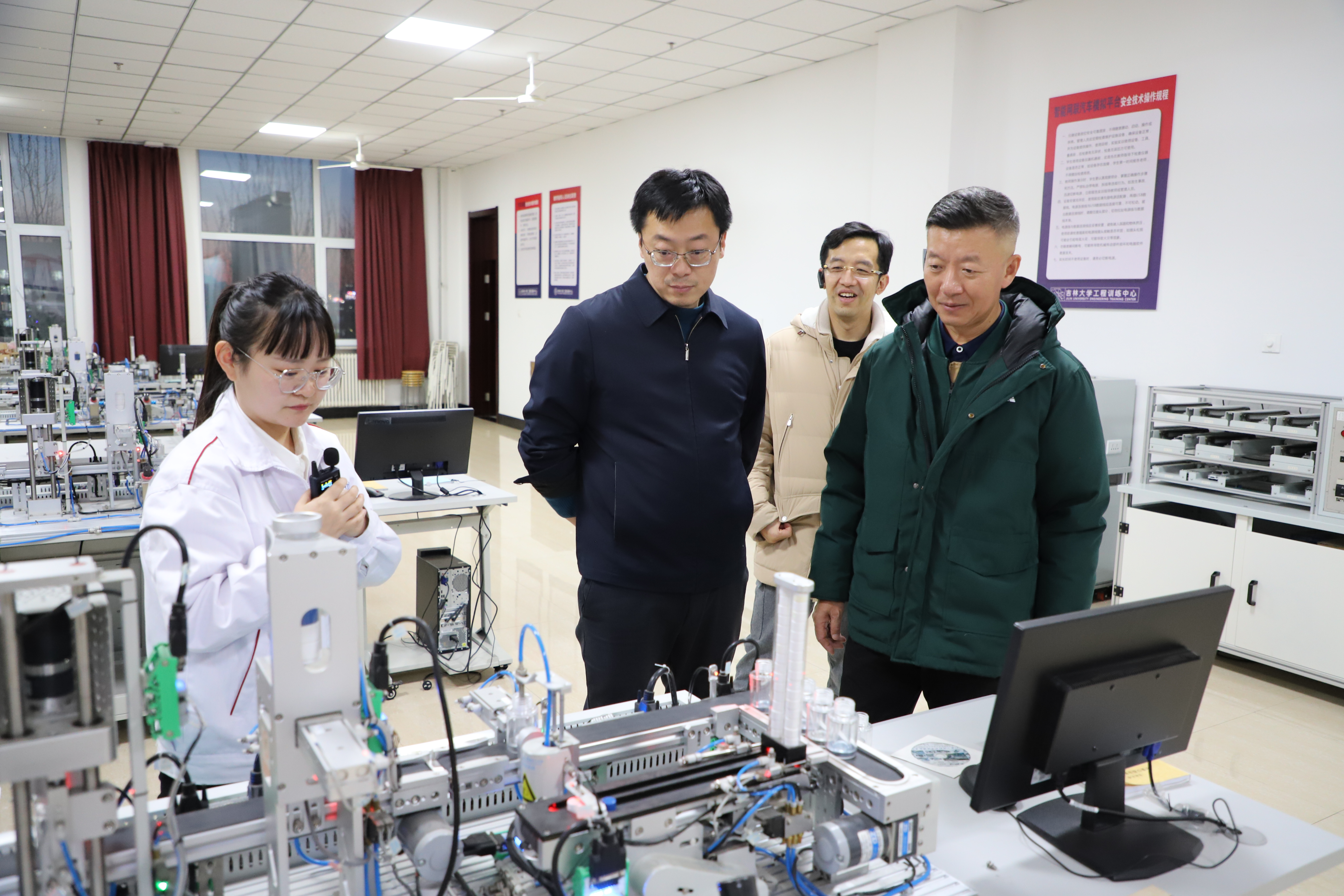 随后马佳一行走进工程训练中心,从加工中心、智能制造、激光加工到数控车、竞技机器人、多线联动等实训教学场所,对工程训练中心的实验室建设和实践教学给予了高度称赞,同时在现场也感慨着工程训练中心的巨大变化,追忆起曾经挫金工锤子的年少时光。