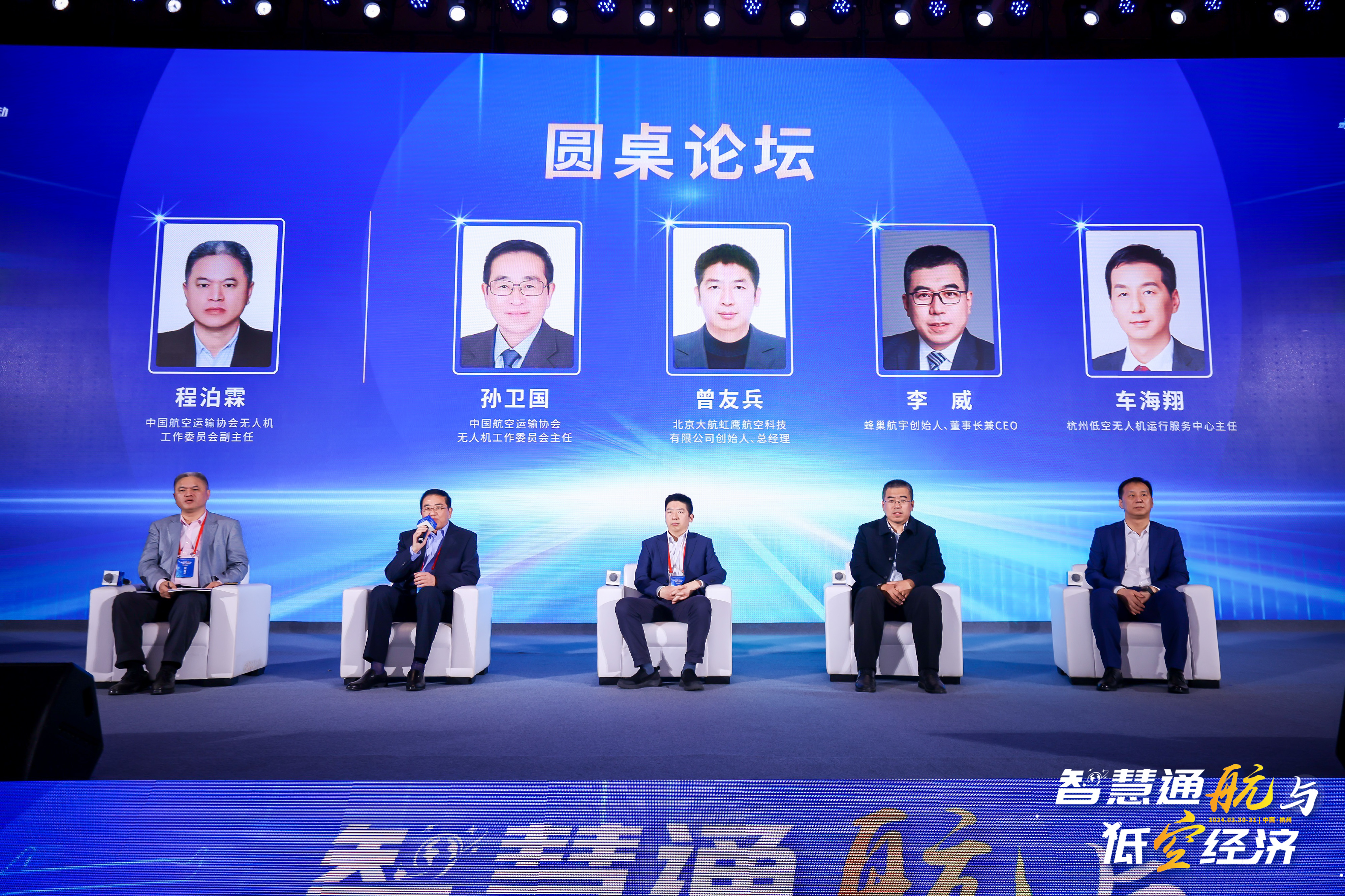 随后,大会进入圆桌论坛环节。圆桌论坛由中国航空运输协会无人机工作委员会副主任程泊霖主持,嘉宾包括中国航空运输协会无人机工作委员会主任孙卫国,北京大航虹鹰航空科技有限公司创始人兼总经理曾友兵,蜂巢航宇创始人、董事长兼CEO李威,杭州低空无人机运行服务中心主任车海翔。各位专家与企业家围绕低空经济领域,针对无人机产业的发展趋势、技术创新以及行业应用等话题,展开了深度交流与思想碰撞。
