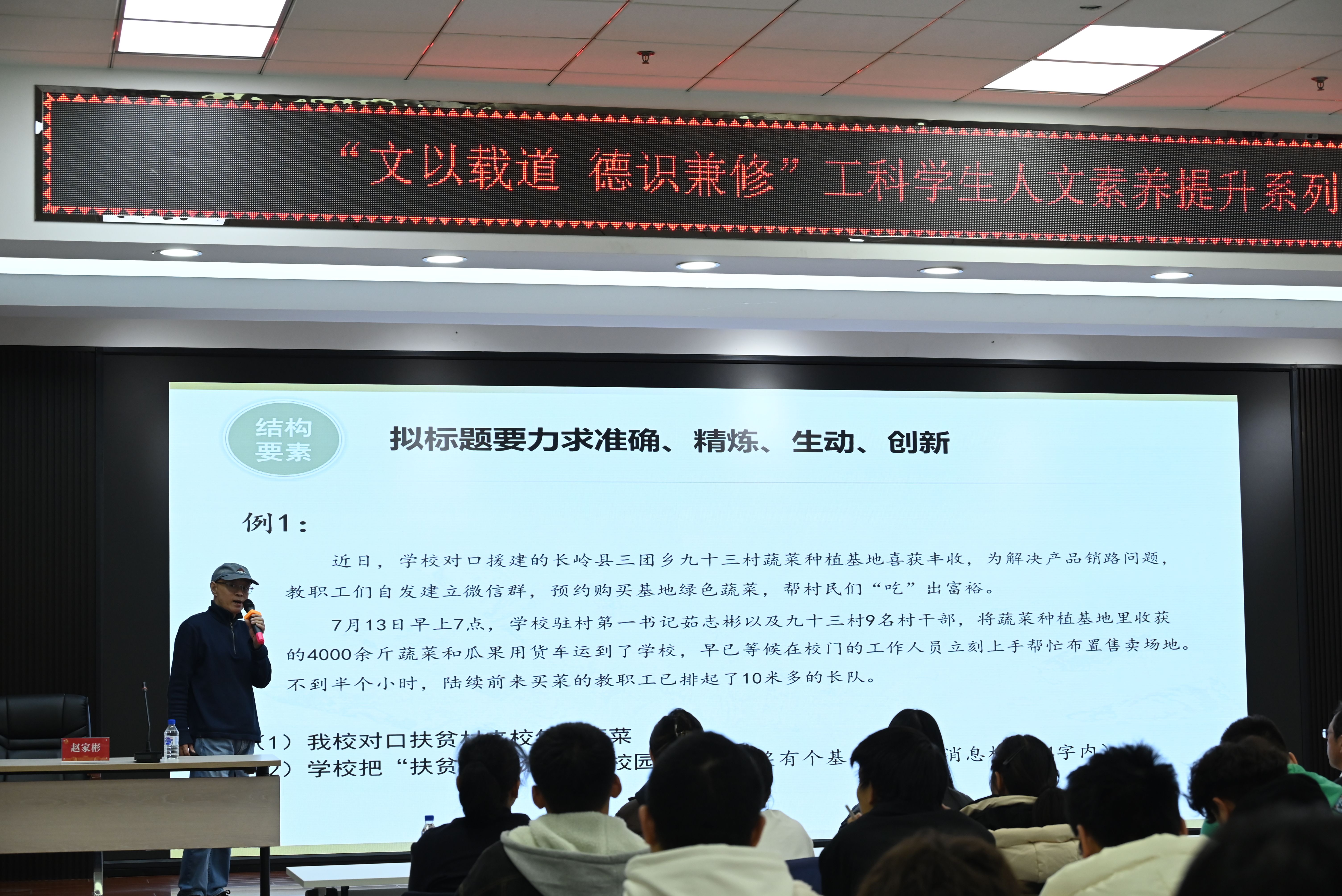 为提高公司员工的新闻写作能力,11月5日,公司团委在逸夫机械材料馆802报告厅举办了“文以载道,德识兼修”工科员工人文素养提升系列活动。本期活动特别邀请公司党委宣传部赵家彬老师作为主讲嘉宾,公司行政副经理马研、员工工作办公室全体辅导员老师出席本次活动,团学组织全体成员参与。赵老师以丰富的新闻宣传经验和深厚的专业知识,为同学们带来了一场知识盛宴。
