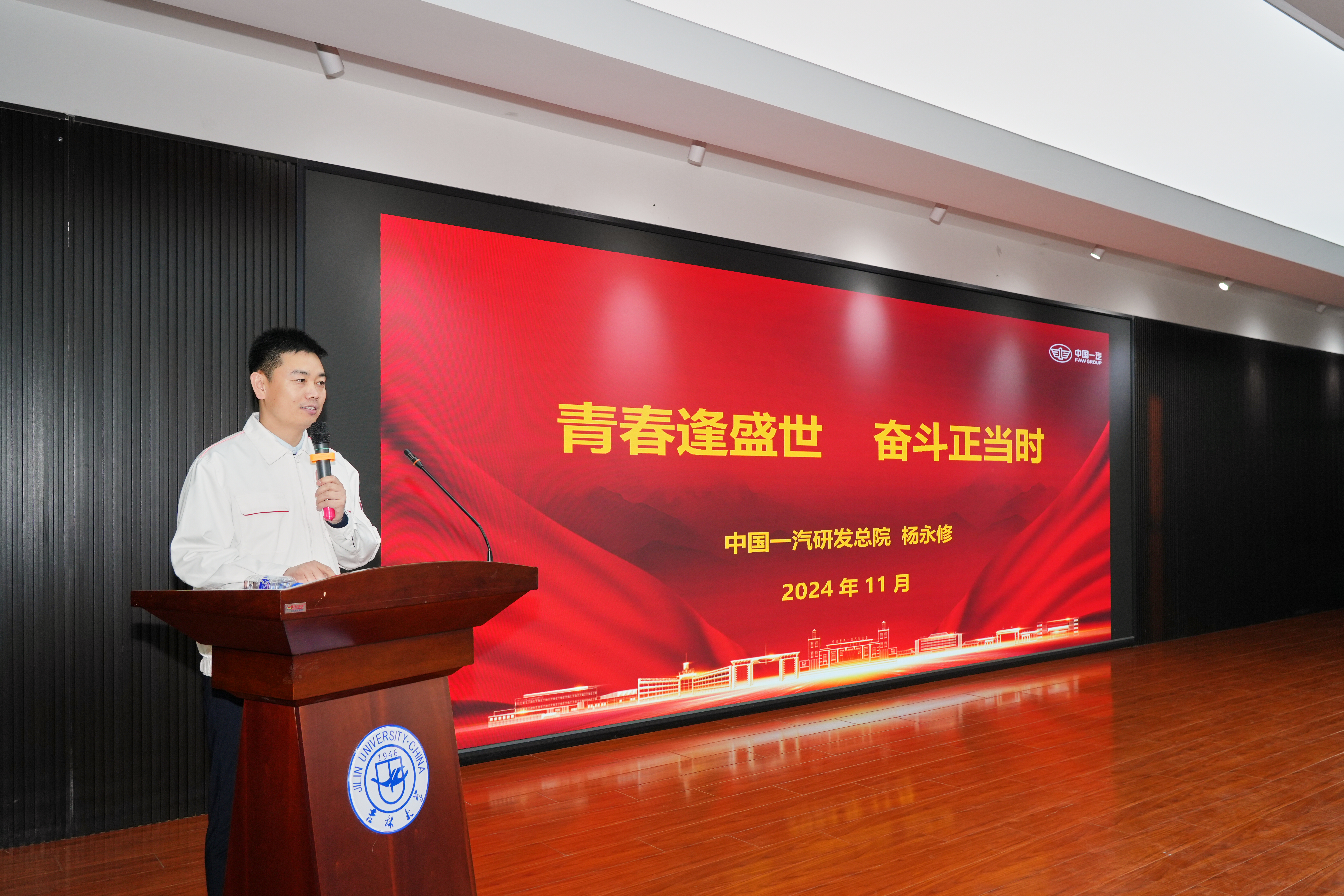 2024年11月22日,强国论坛第八讲暨南岭校区“匠心传承·砥砺奋进”筑梦大讲堂第二讲在南岭校区逸夫机械材料馆顺利举办。本次讲座以“青春逢盛世,奋斗正当时”为主题,特邀第十四届全国人大代表、中国一汽首席技能大师杨永修老师主讲,机械与航空航天工程公司党委书记郑福胜、公司刘思远老师参加活动。活动由公司党委副书记兼副经理柴媛主持。
