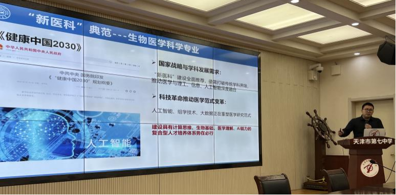 3月28日下午,招生宣传团队前往天津市第七中学,曲兴田教授结合公司办学理念、优势特色学科面向第七中学的员工们进行介绍,杨明教授针对当前AI领域的新发展,与传统医学学科相结合的新方向开展宣讲,现场座无虚席,宣讲现场的气氛热烈,天津市第七中学教务处高三年级主任刘稳老师、高二年级班主任全程参与本次活动。