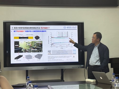 报告中,果立成教授系统介绍了其团队在复合材料疲劳损伤机理与评价方法方面的创新成果。他重点阐述了多信息融合的复合材料损伤表征方法,通过整合同步辐射CT、三维DIC、红外热成像和声发射技术等先进检测手段,实现了复合材料从微观到宏观的多尺度损伤精准表征。通过多源数据融合,团队建立了更完善的复合材料疲劳损伤评价体系,为工程应用中的寿命预测与可靠性评估提供了新思路。研究团队设计了不同载荷的疲劳试验台,研究了复合材料在拉-拉和拉压载荷、剪切疲劳载荷、双轴拉-扭高低周载荷下复合材料的损伤机理。
