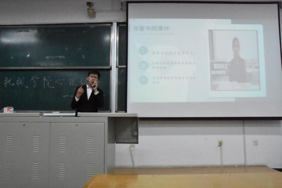 此次活动由心语工作部副部长担任主讲。讲座伊始,他先就大学规划和未来展望发表演讲,并结合自己转专业的经验与心路历程,认真分析了大学新生常见的心态问题并提出中肯的建议。讲座的第二部分,他就面对挫折和处理人际关系展开分析,并通过对马加爵事件等的案例分析,从心理学角度去看这些问题,引起大家的深思。接着,他就社会意识这一问题,通过豫章书院等一系列事件,从不一样的角度切入分析,带给我们深刻的了解。