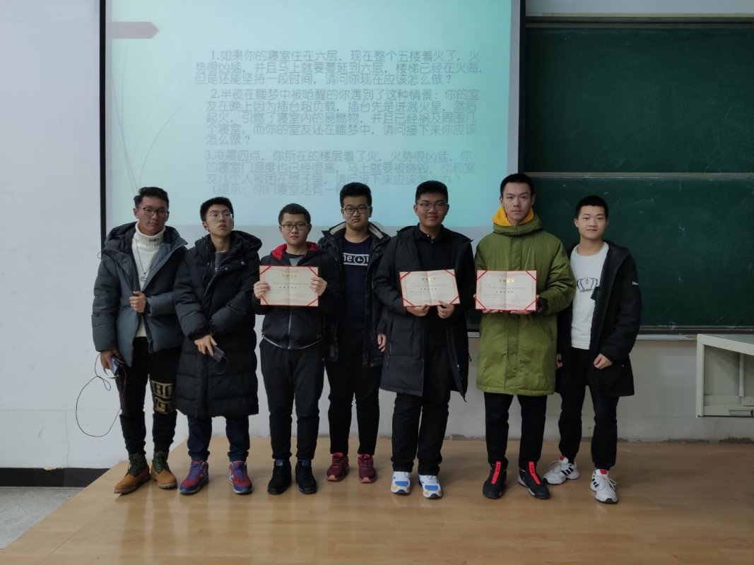 按照预定时间,各班代表队来到指定地点就座。首先,主持人对活动安排以及比赛流程进行了详细地介绍。前两轮比赛是抢答形式,各支代表队通过抢答QQ群内的问题,来获得消防问题的答题权,同学们情绪高涨,积极参与,比赛进行的如火如荼。很快,经过两轮比赛的激烈角逐,六班、七班、九班脱颖而出,晋级第三轮的火灾情景题。三支代表队依次选择三个火灾情景逃生题并进行讨论,共同构思逃生方案。在此期间,屏幕上播放了关于消防案例的视频,视频中一个个真实的案例引发了在场同学们的思考。随着视频的结束,三支代表队已经准备完毕,各代表队派出一名代表分别进行了陈述。最后,通过对各代表队临场发挥情况进行投票,选出本次比赛的冠军亚军和季军,并合影留念。至此,本次消防知识竞赛圆满结束。