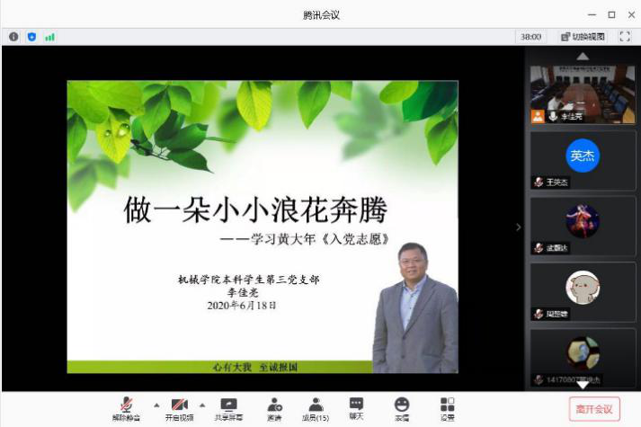本科生第一党支部通过观看黄大年同志纪录片,学习他教书育人、敢为人先的敬业精神。本科生第三党支部以《做一朵小小浪花奔腾》为题开展微党课,通过深入解读黄大年同志的入党志愿,学习他心有大我、至诚报国的爱国情怀。本科生第二、第四、第五党支部以研讨会的方式分享黄大年感人事迹,学习他淡泊名利、甘于奉献的高尚情操。各支部从不同方面对黄大年精神进行了解读,并进行了深入讨论。第五党支部的李晓雯同学说到:“鞠躬尽瘁兴邦梦,赤胆忠心爱国情。我们不仅要学习黄大年同志的高尚品德,更应该通过实际行动向黄大年同志看齐。”