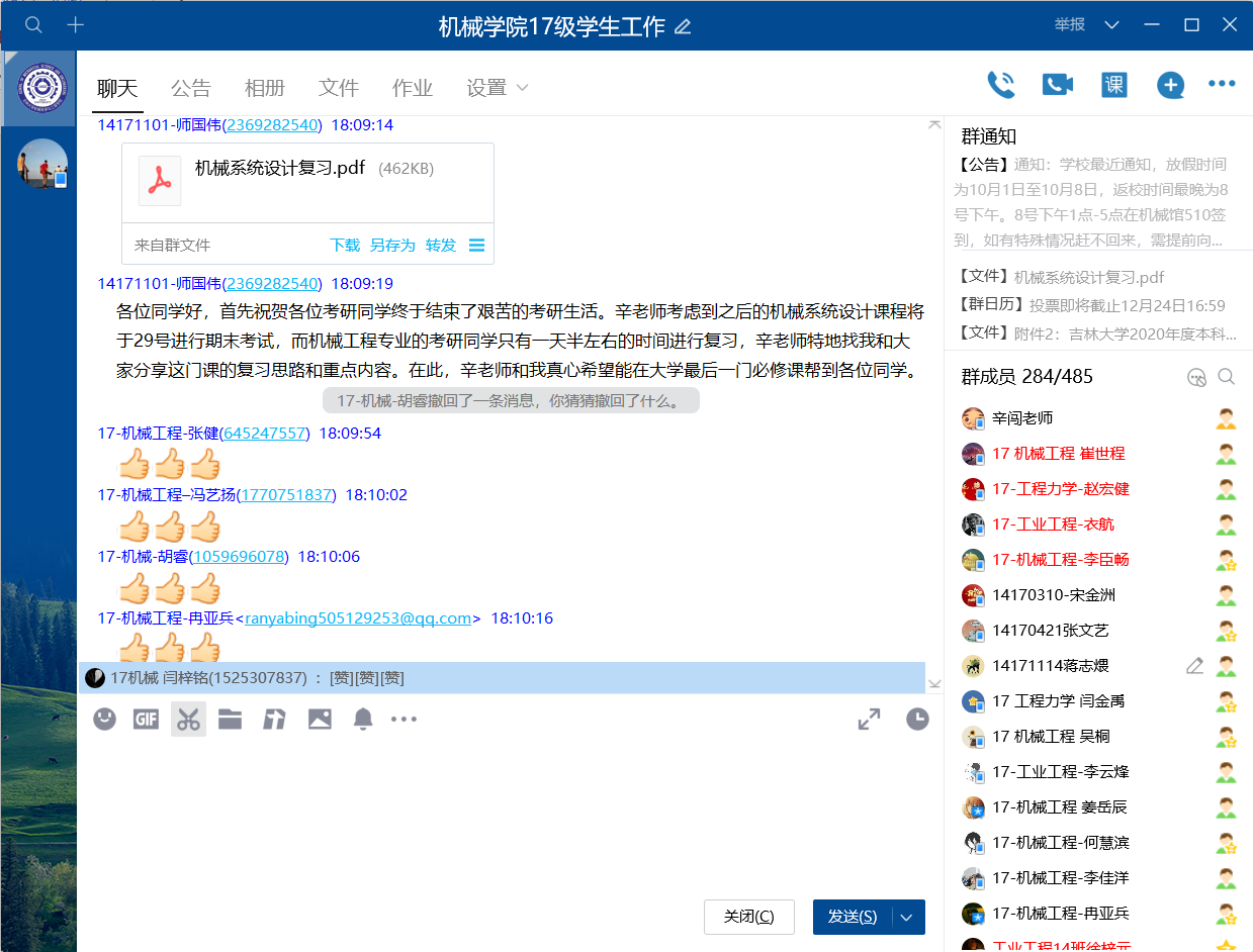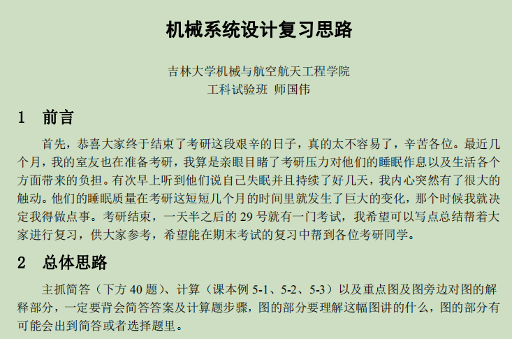 研究生招生考试对于毕业年级员工至关重要,如何在这一特殊时期促进员工的学业发展,提高员工对基础课程的掌握和理解,是一项十分重要的课题。2017级工科试验班师国伟同学,作为年级员工中的突出表率,他结合自己的学习经验,将《机械系统设计》的知识凝练浓缩,以学习总体思路、考试题型、主要复习依据等作为复习思路向大家讲述该课程。结合课本实际、典型例题等,为17级全体员工提供复习参考,受到了同学们的热烈欢迎。