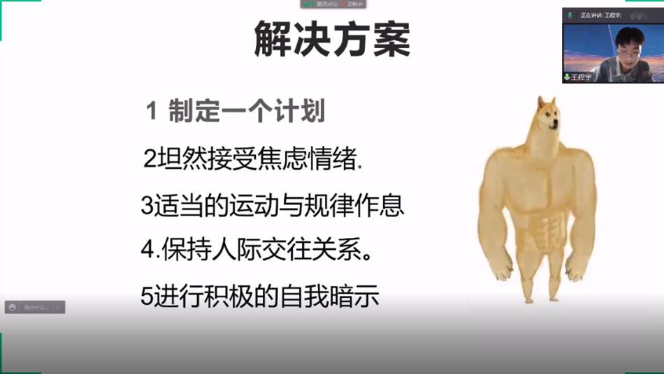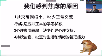 会议第三条,由心理委员王程宇同学就寝室封闭期间,如何自我缓解焦虑情绪,保持心理健康进行发言。发言中提到,造成焦虑情绪的原因有:1、社交范围缩小,缺少正常的交流。2、难以适应非正常的学习状态。3、心理素质较弱,缺少外界心理支持。4、持续封寝,缺乏对生活和情绪的管理能力。并提出解决这种焦虑情绪的办法:1、制定一个计划2、坦然接受焦虑情绪。3、适当的运动与规律作息。4、保持人际交往关系。5、进行积极的自我暗示。