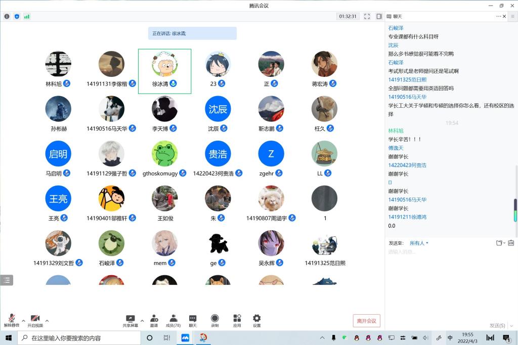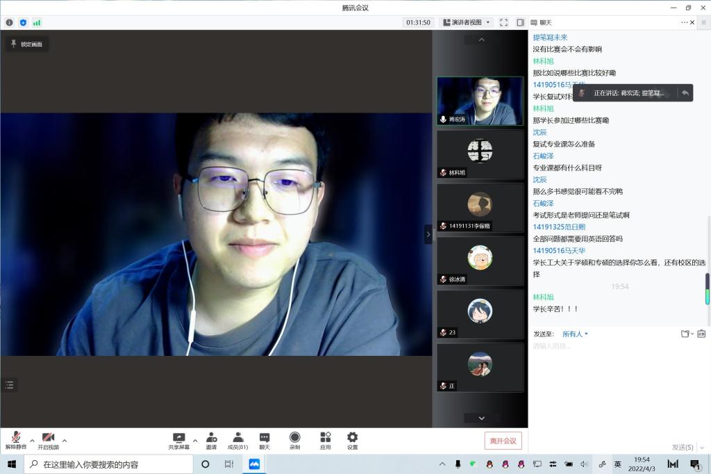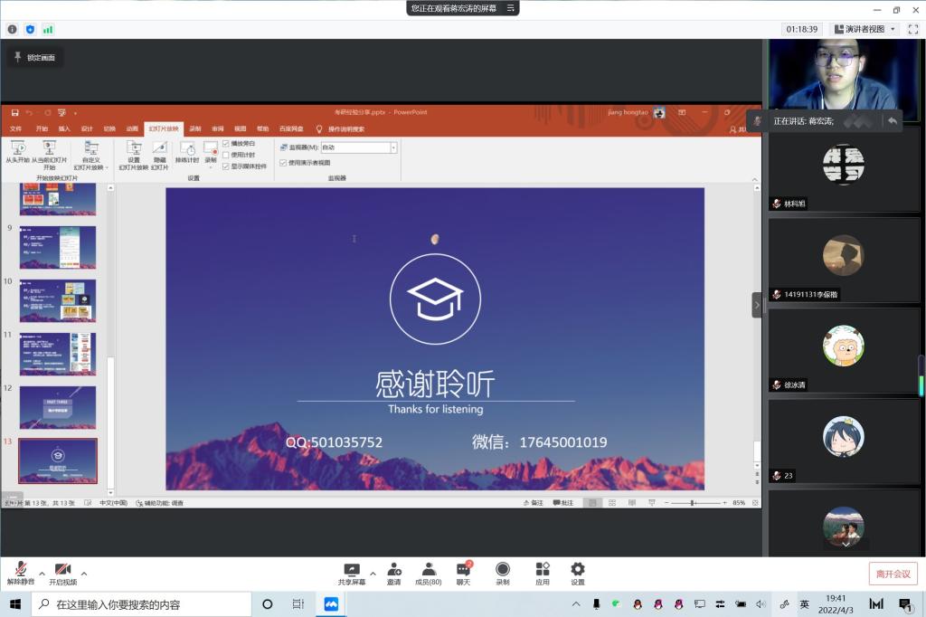 作为23考研的主力,19级同学踊跃参与到本次会议中,期待能够收获宝贵的考研经验。蒋宏涛同学以PPT讲解方式,根据个人经历沉浸式分享自己的考研之路和心路历程。蒋宏涛提到考研最重要、也是最先要考虑的环节是选择公司,其次才是系统学习和模拟冲刺。他向与会人员分享了自己各个科目备考选择的资料、老师,干货满满。徐冰清首先介绍了自己报考公司的考研情况。徐冰清同学着重于从时间线上着手,向大家分享自己的经验和一些好的习惯,同样分享了一些优质资料和优秀老师。最后参会同学向学长学姐提问相关问题,并得到了两位的耐心回答。此次会议圆满结束。