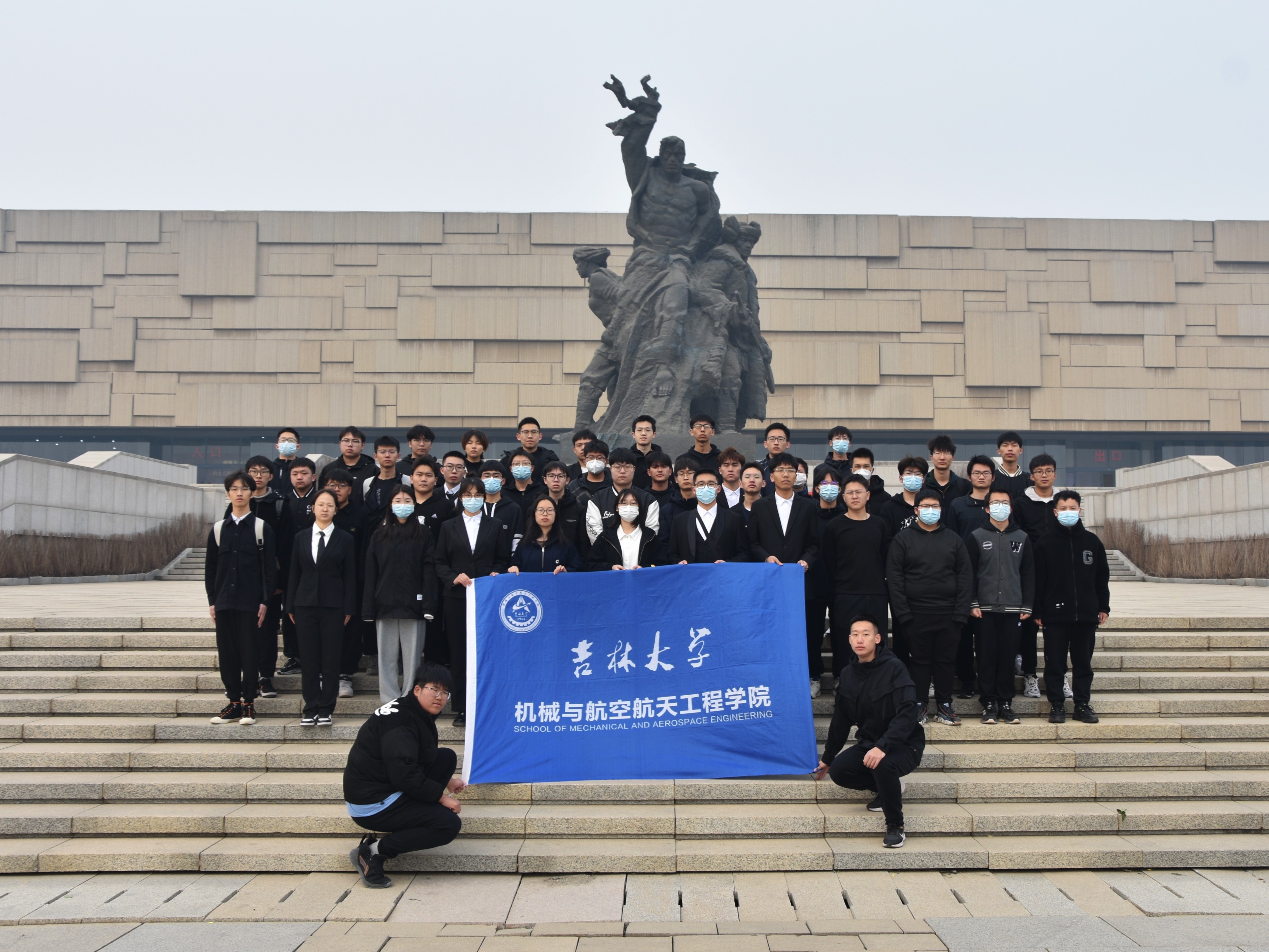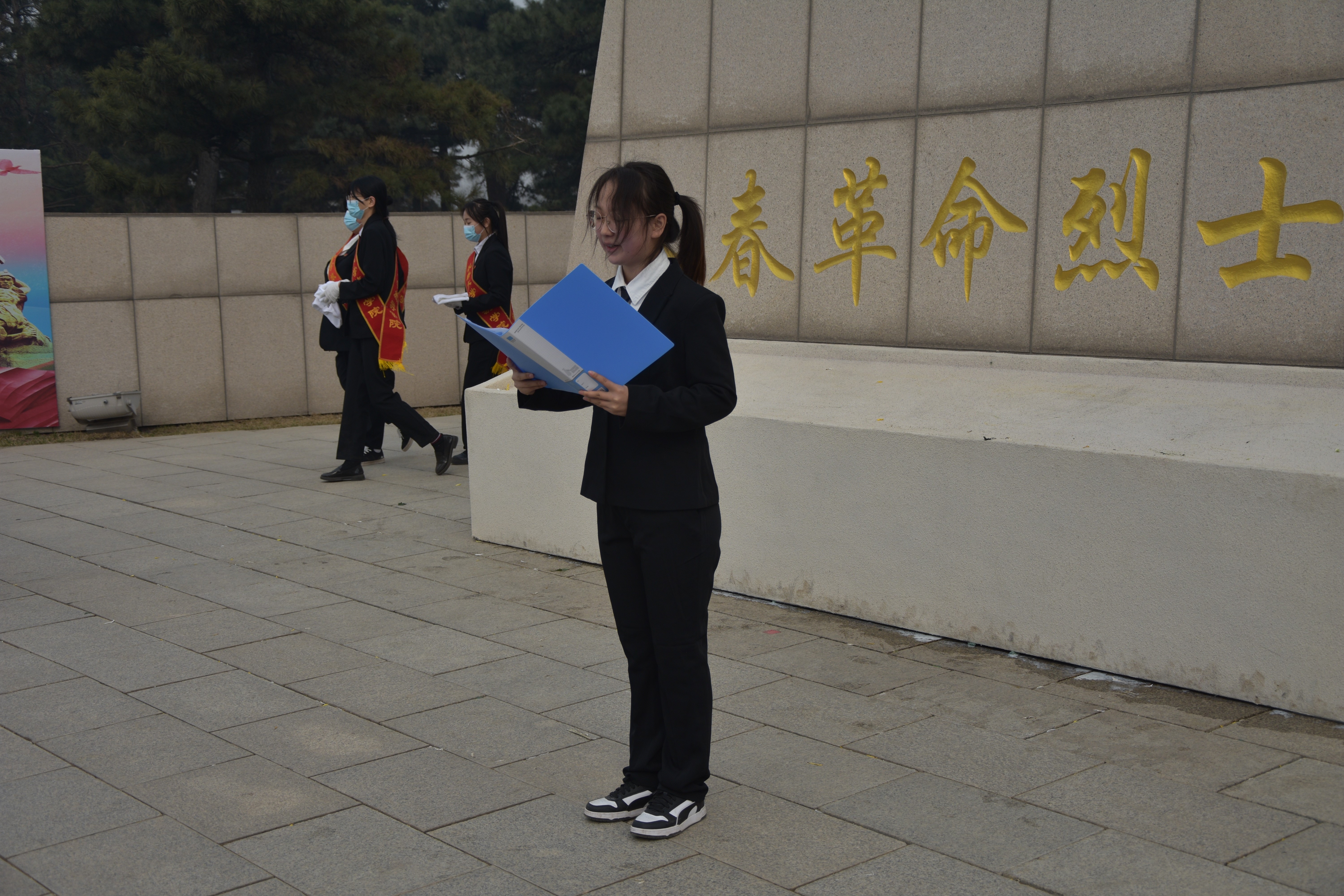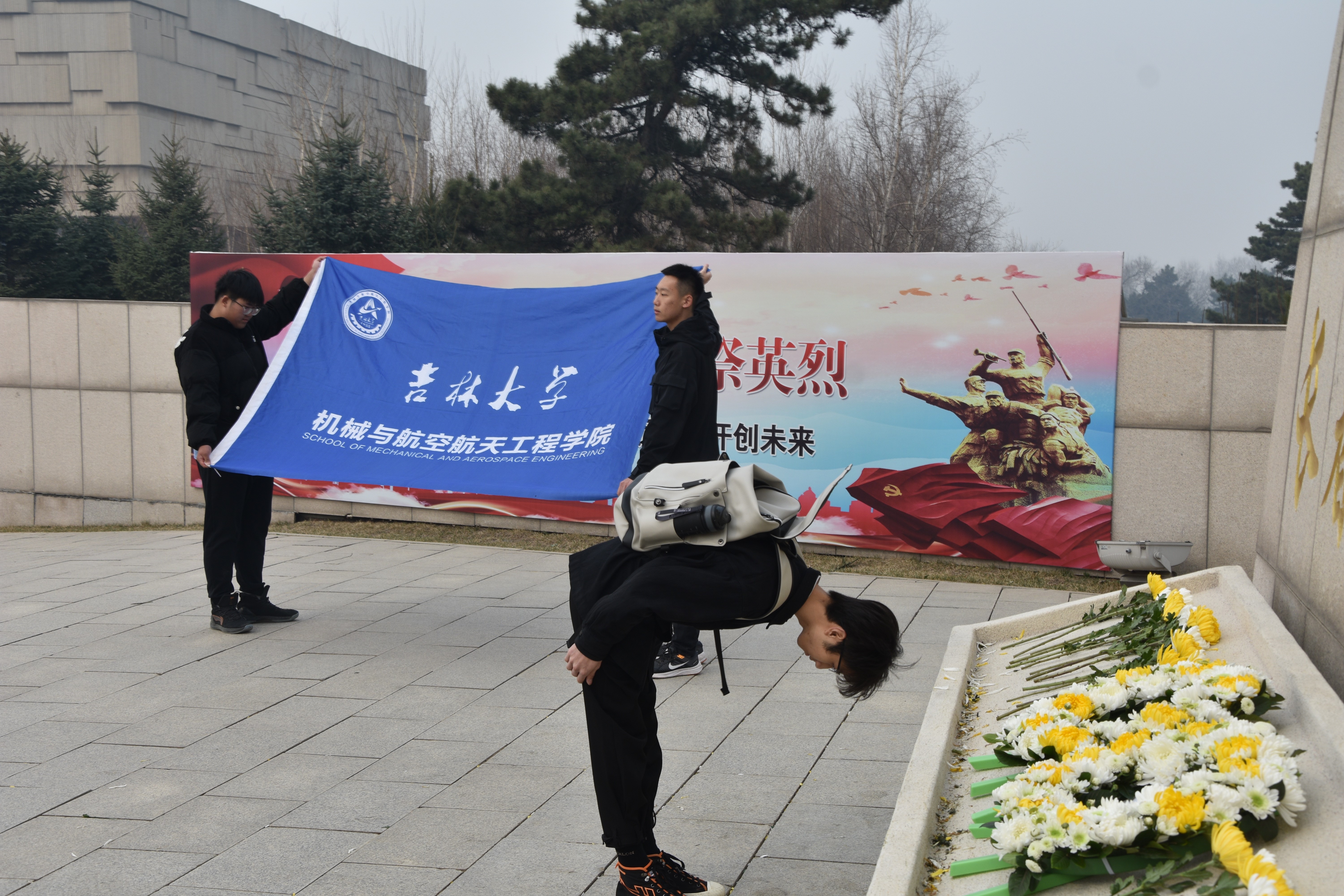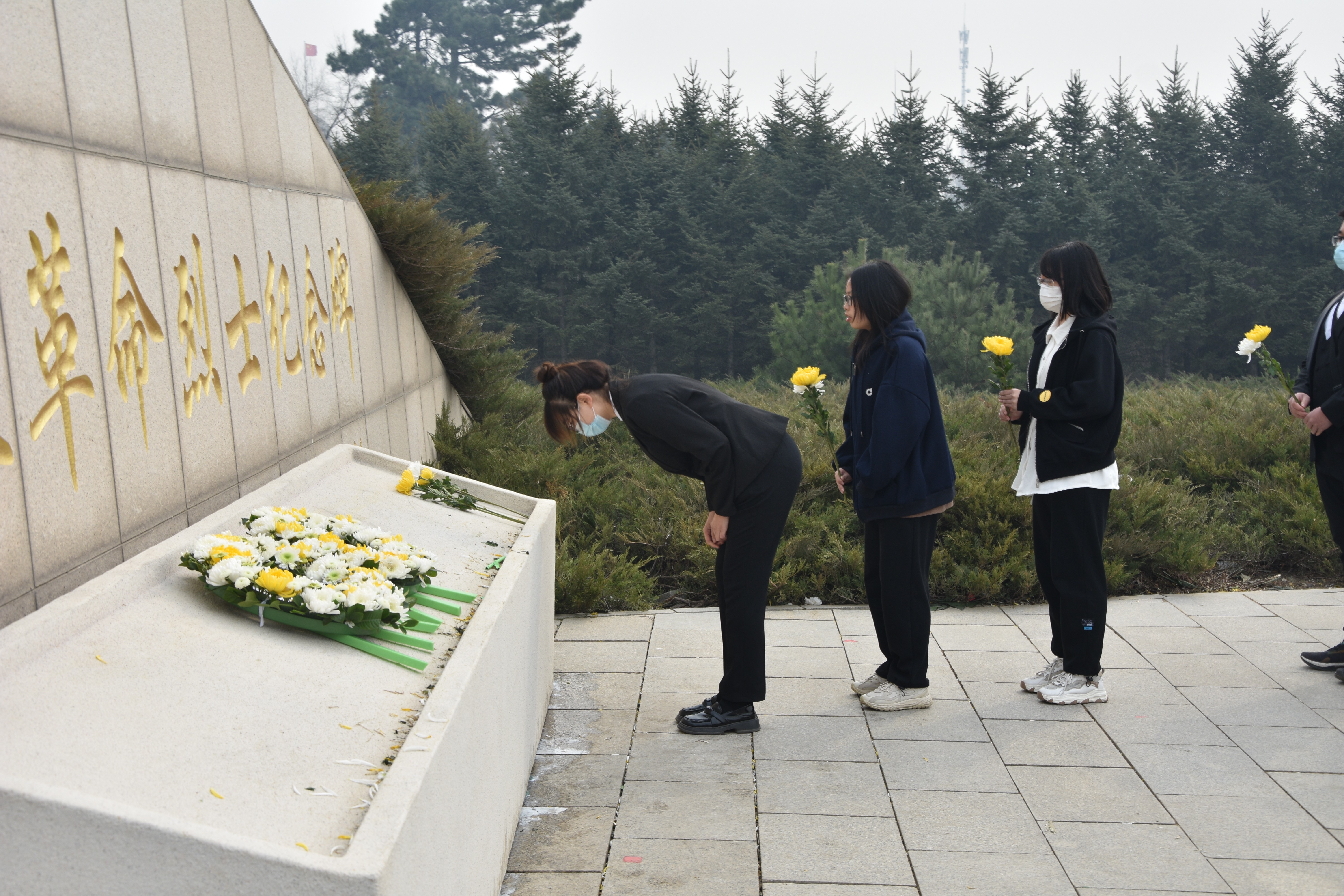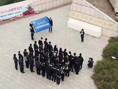 2023年4月5日上午9:00,大巴抵达长春市革命烈士陵园。2021级员工代表李赫同学在纪念碑下做祭扫演讲,瞻仰“长春革命烈士纪念碑”,全体默哀三分钟。
