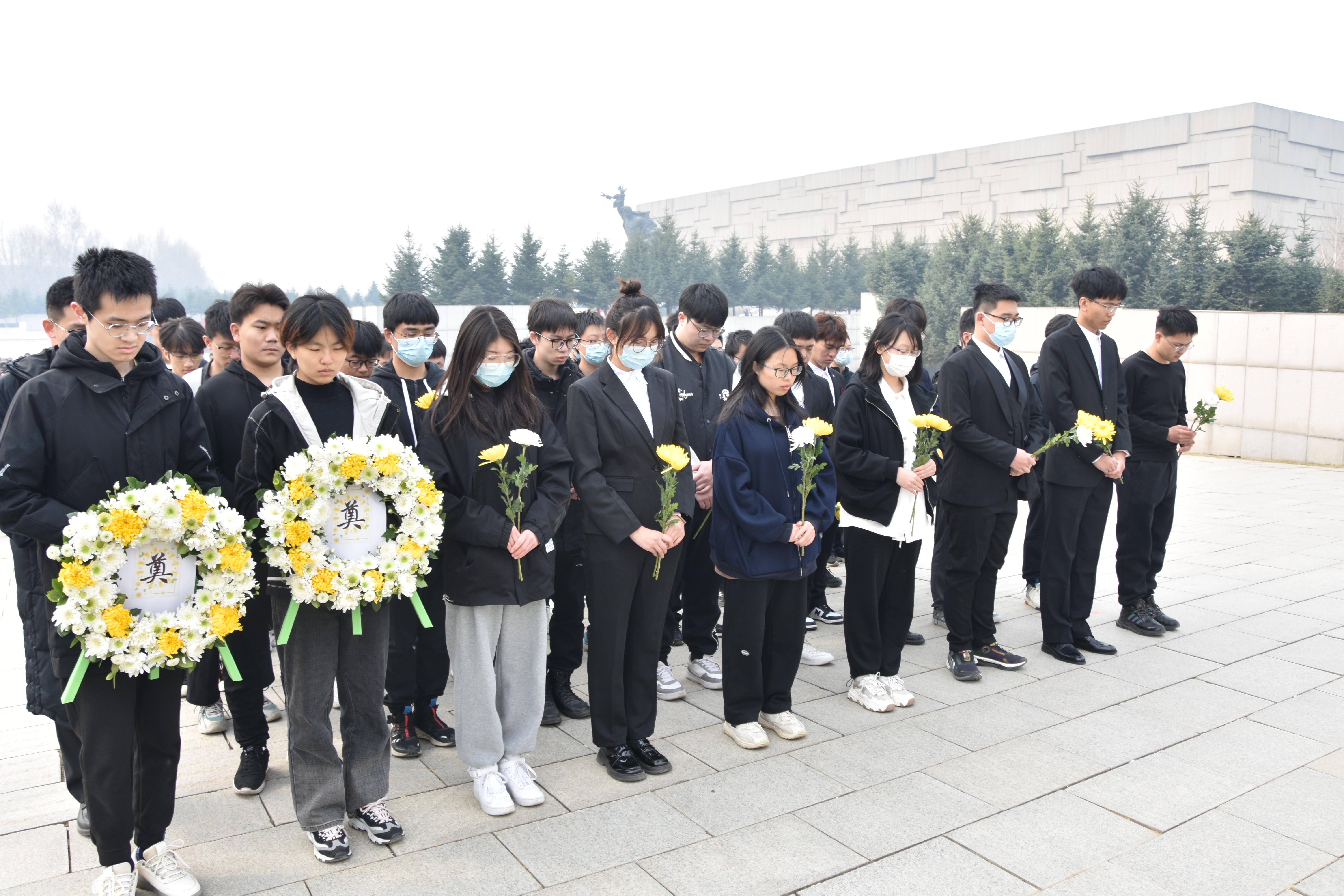 随后举行集体献花仪式。同学们肃立在纪念碑前,心中寄托着对逝去先人永恒的怀恋和无尽的感激,依次献上手中的黄白菊花,在庄严肃穆的氛围中,告慰逝者,祈愿和平。仪式结束,同学们移步至革命烈士纪念馆,重温英烈们的先进事迹和中国革命的发展历史。走近壁画仿佛还能看到先烈们坚定执着的眼神,听见嘹亮激昂的口号,同学们心中不禁热情澎湃,更感当今和平生活的来之不易。