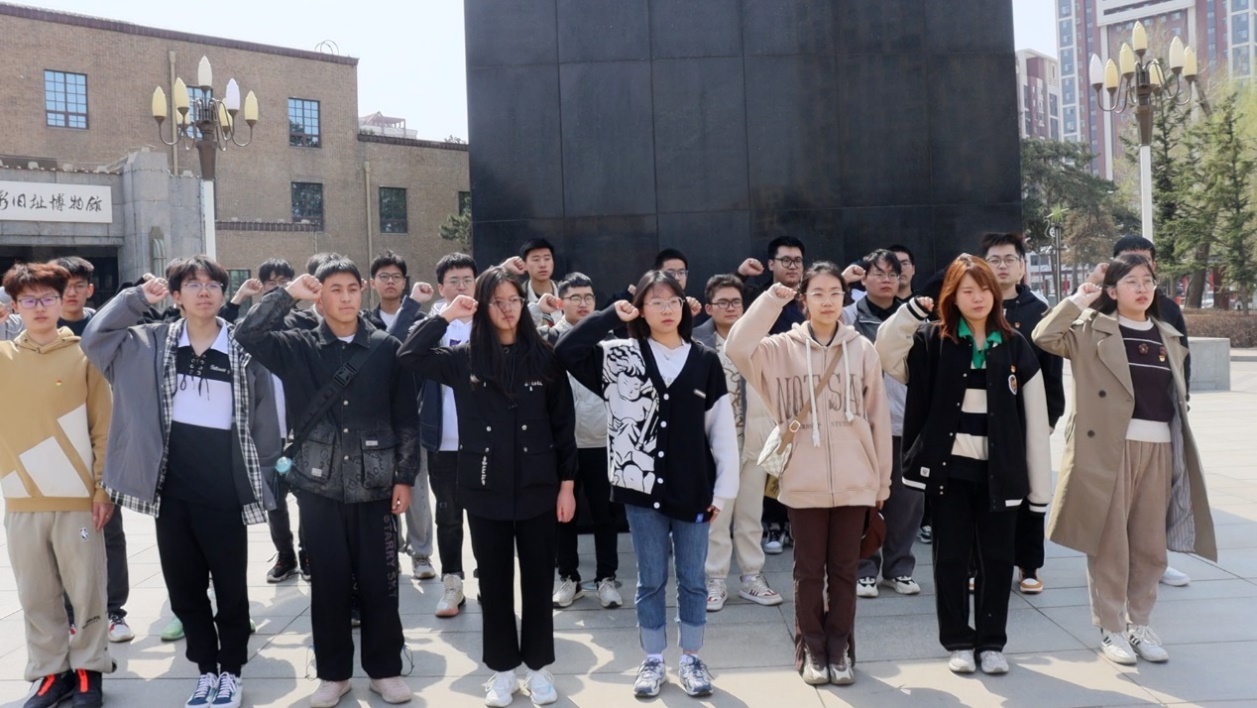 参观即将结束时,所有党员重温入党誓词,在飞扬的党旗下缅怀先烈,立志前行。