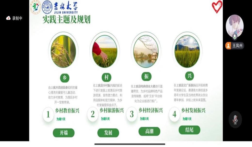 其次,介绍本次团队实践安排。实践过程分为四个环节,并规划了时间分配。从教育、旅游、经济、就业创业四方面实施,深入贯彻落实习近平总书记关于“三农”工作的重要论述,达到实践育人、实践促学、实践促兴的目的。